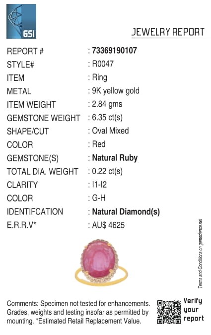 • Accompanied by Gemmologist Report issued by Gemological Science International (GSI).Total Valuation:$4650