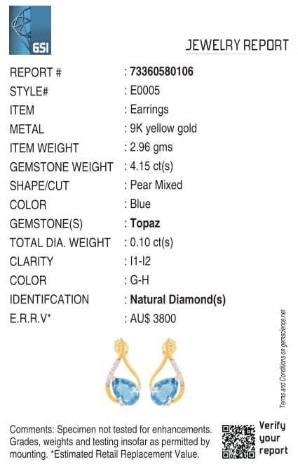Yellow Gold Natural Swiss Blue Topaz & Diamond Earrings with Valuation