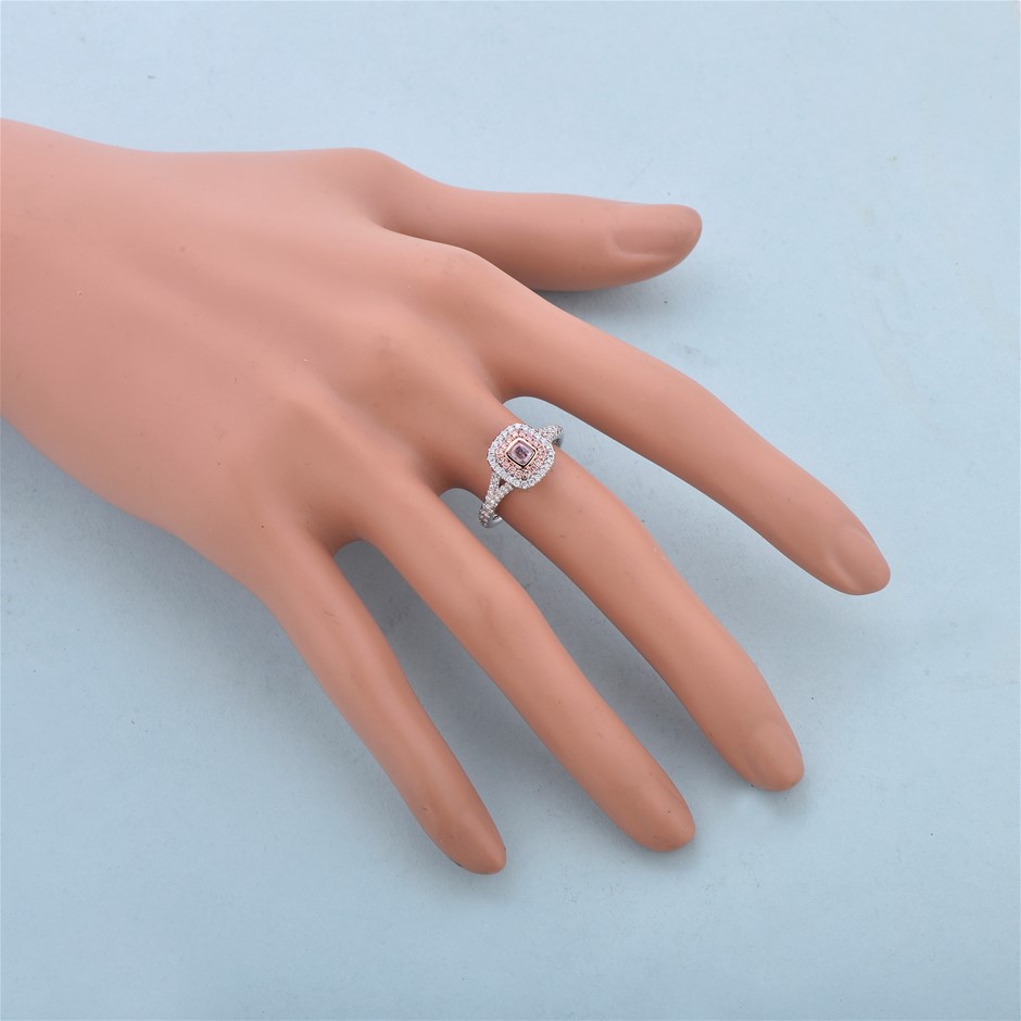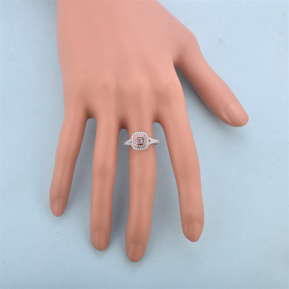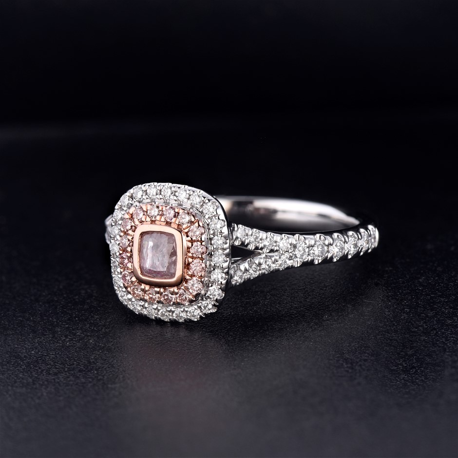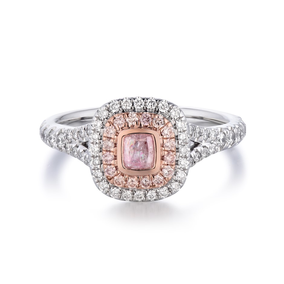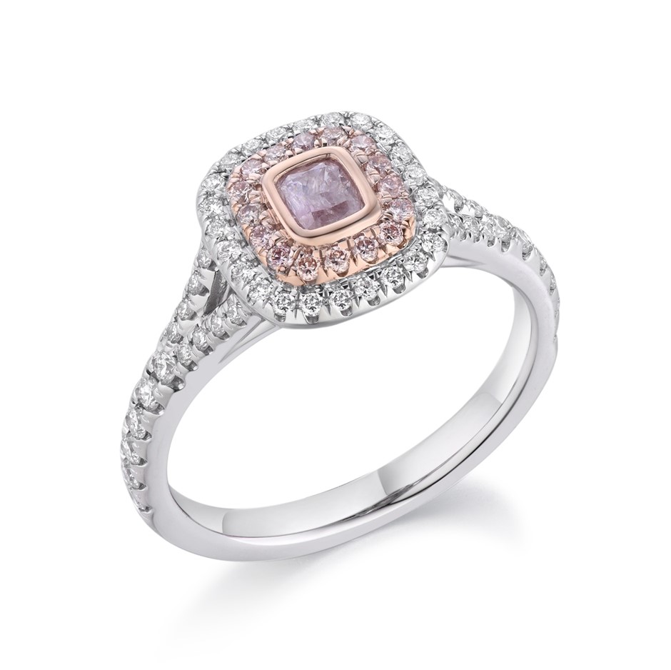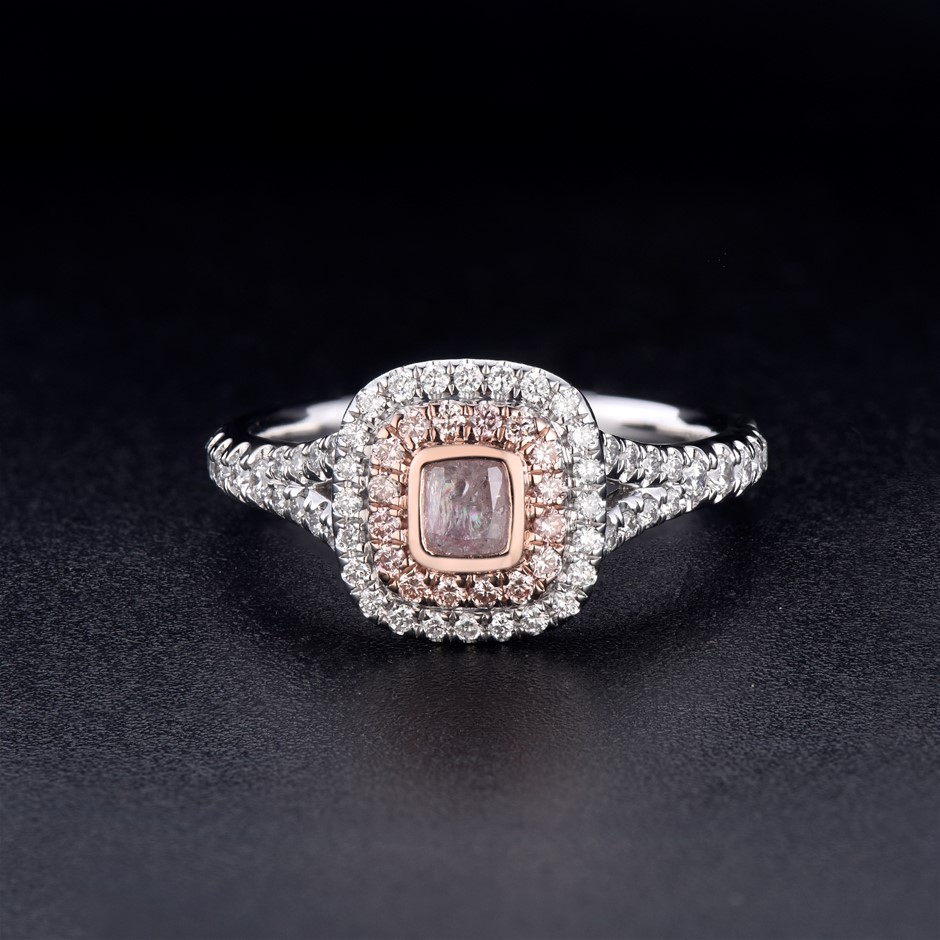 Item Description: One cast and assembled 9k white and rose gold double halo ring with natural pink diamond in the centre and supporting CVD melee diamonds and CVD pink diamonds, with a half-round shank (Stamped G9K).