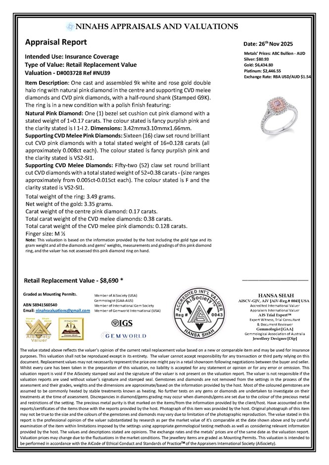 Natural Pink Diamond: One (1) bezel set cushion cut pink diamond with a stated weight of 1=0.17 carats. The colour stated is fancy purplish pink and the clarity stated is I 1-I 2. Dimensions: 3.42mmx3.10mmx1.66mm.
