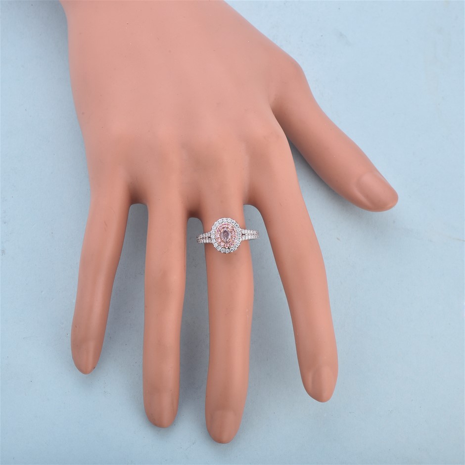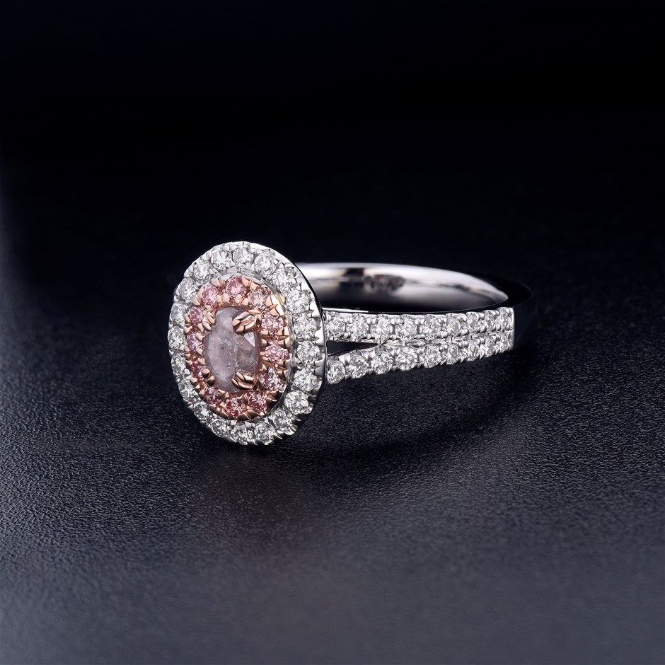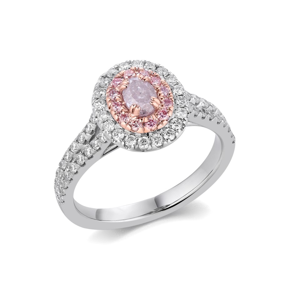 Item Description: One cast and assembled 9k white and rose gold double halo ring with natural pink diamond in the centre and supporting CVD melee diamonds and CVD pink diamonds. The shank is half-round. (Stamped G9K).