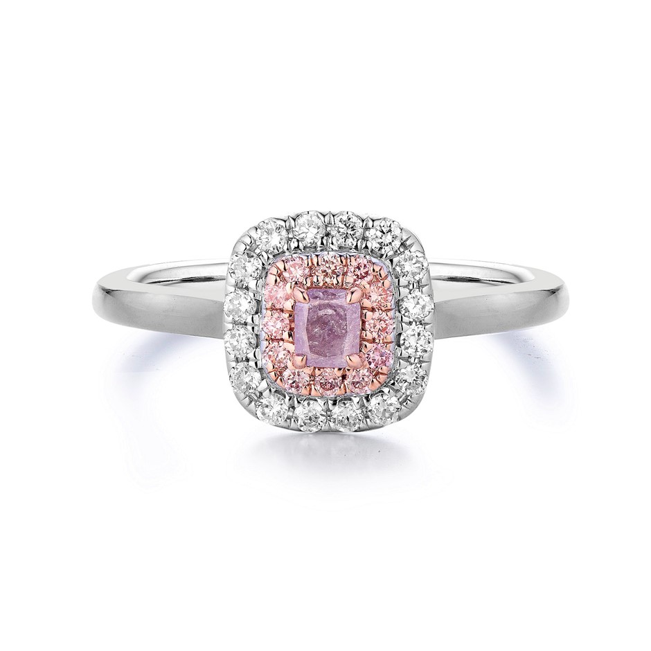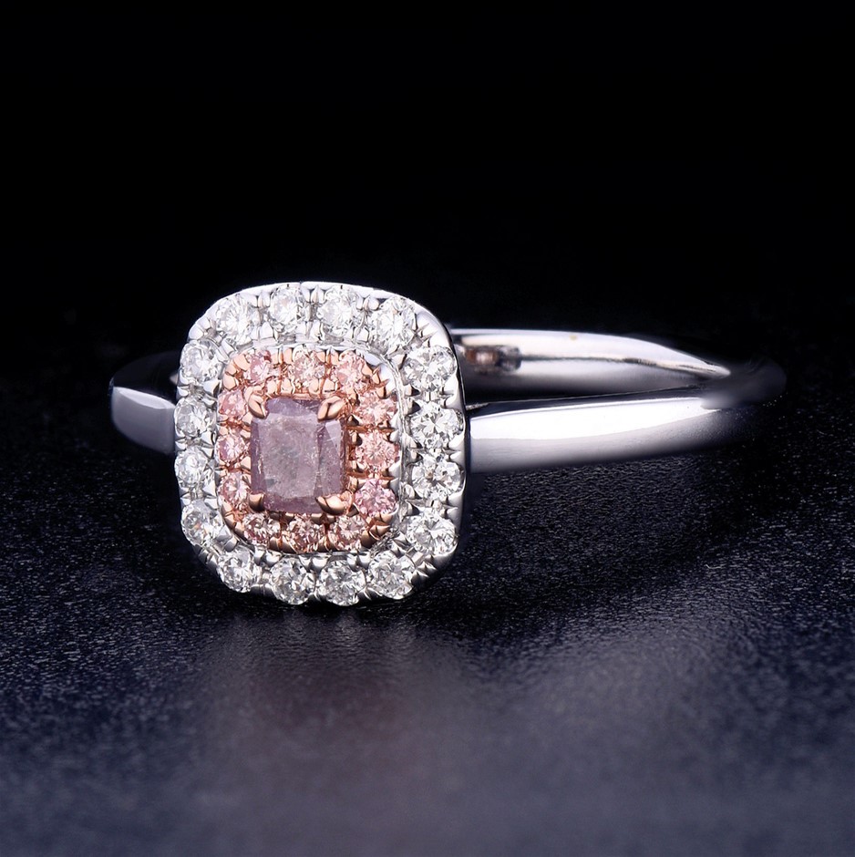 Item Description: One cast and assembled 9k white and rose gold double halo ring with natural pink diamond in the centre and supporting CVD melee diamonds and CVD pink diamonds. The shank is half-round. (Stamped G9K).