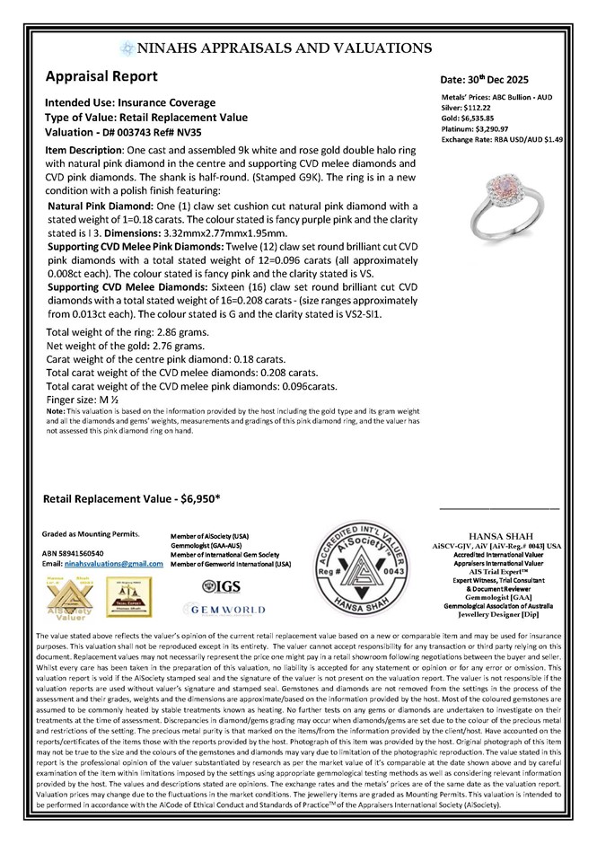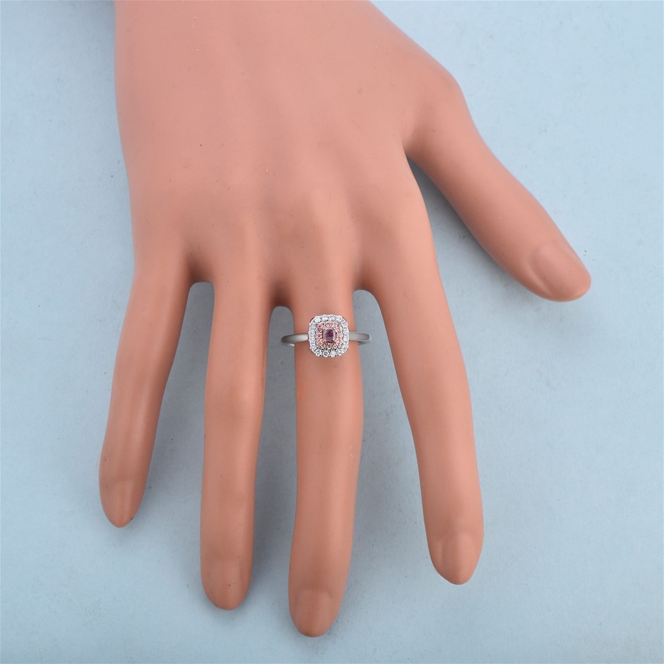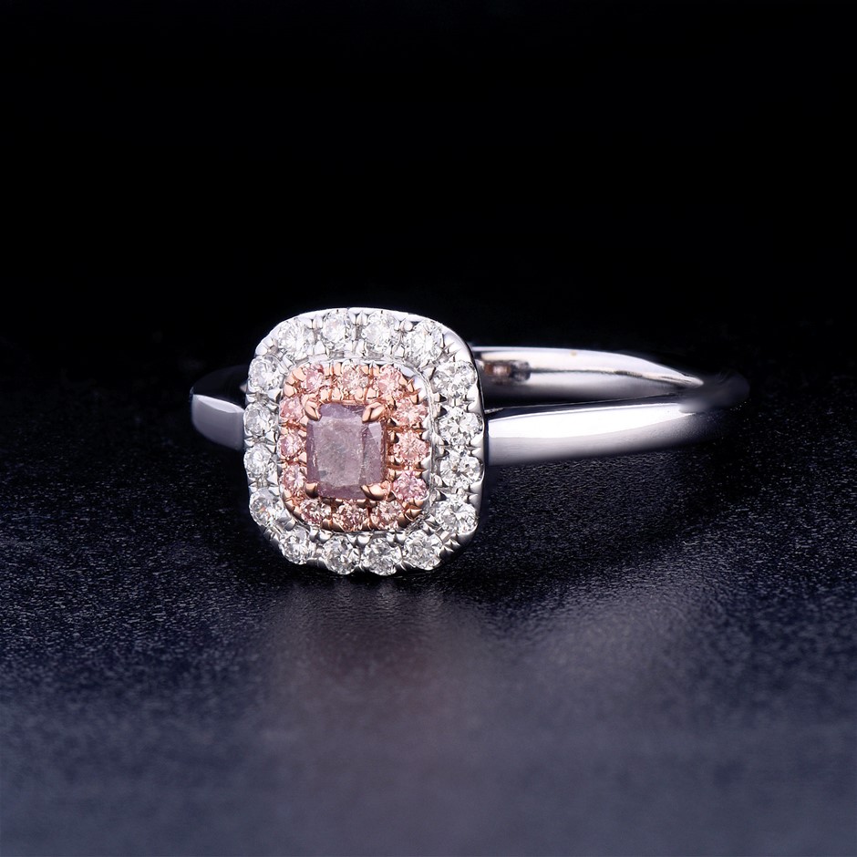 Natural Pink Diamond: One (1) claw set cushion cut natural pink diamond with a stated weight of 1=0.18 carats. The colour stated is fancy purple pink and the clarity stated is I 3. Dimensions: 3.32mmx2.77mmx1.95mm.