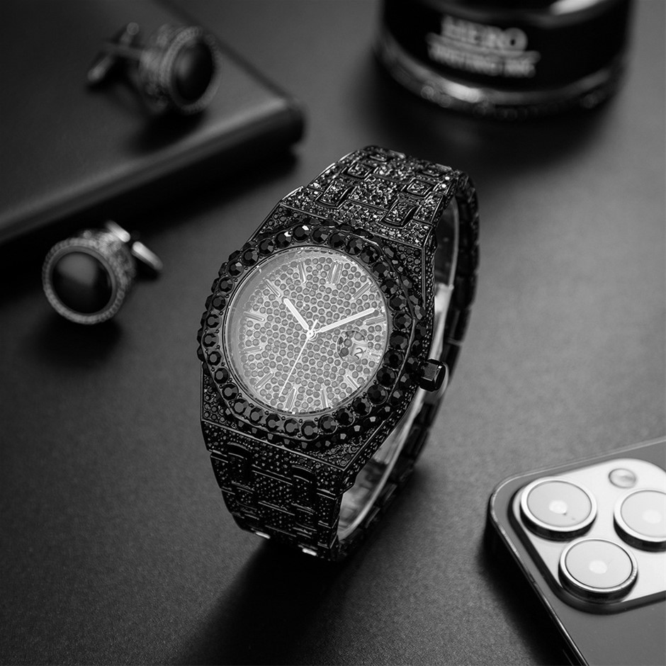 Luxury Black Stainless Steel Full Diamond Quartz Iced Out Wrist Watch