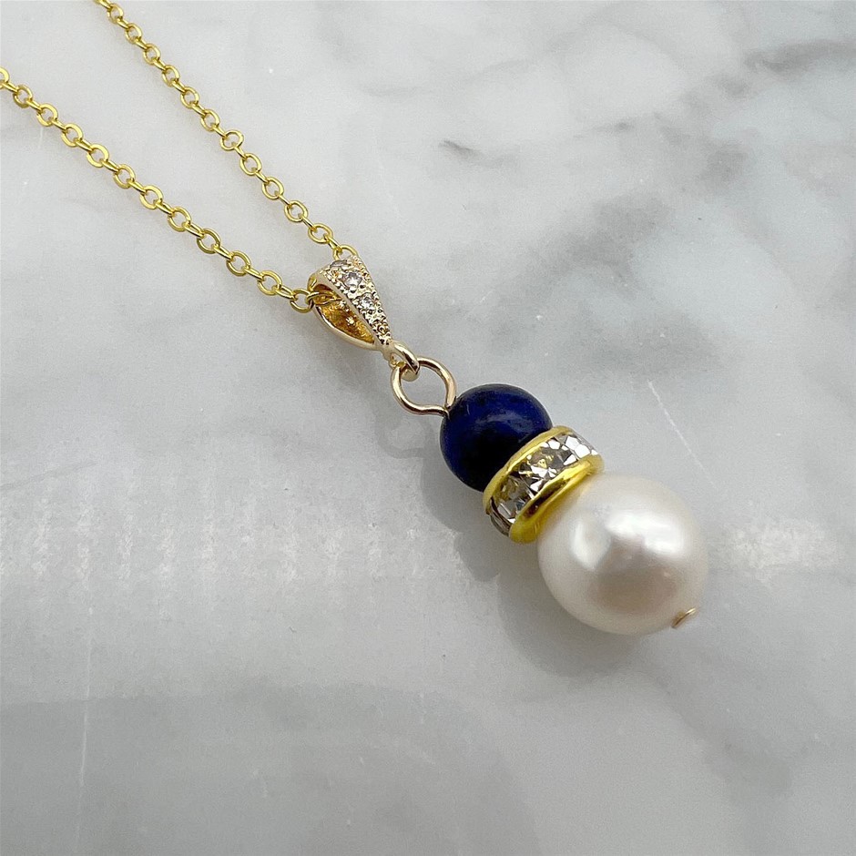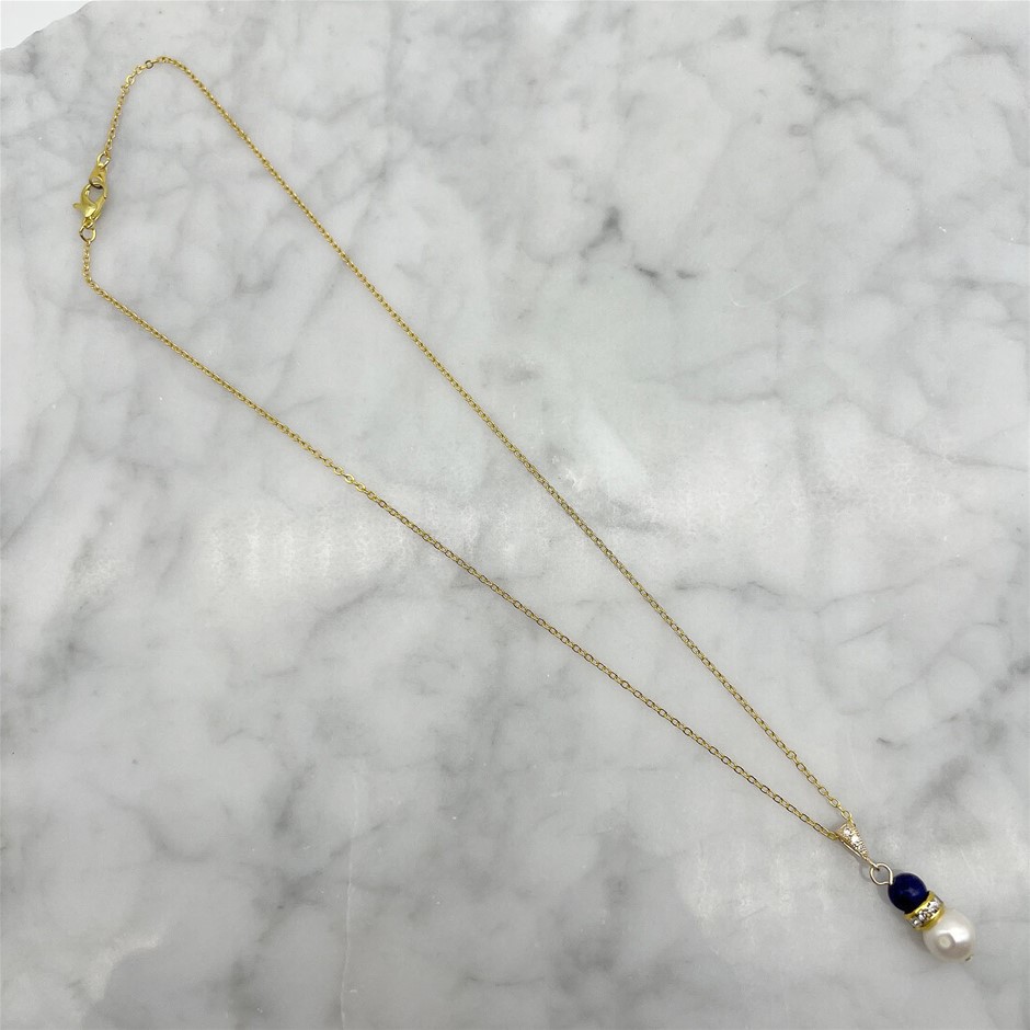 Genuine Pearl & Lapis Lazuli Gemstone Gold Plated Pendant Necklace
