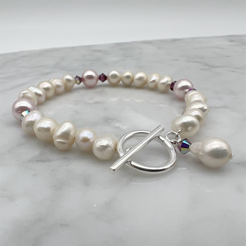7-8mm Natural Potato, Baroque Freshwater Pearl & Swarovski Crystals with `O` Toggle Bracelet.