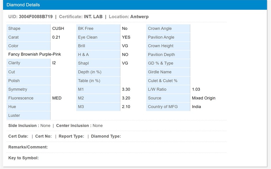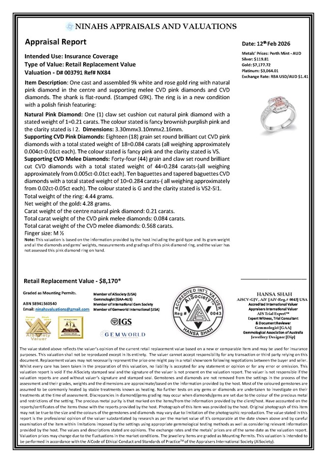 Natural Pink Diamond: One (1) claw set cushion cut natural pink diamond with a stated weight of 1=0.21 carats. The colour stated is fancy brownish purplish pink and the clarity stated is I 2. Dimensions: 3.30mmx3.10mmx2.16mm.
