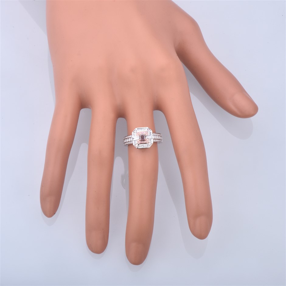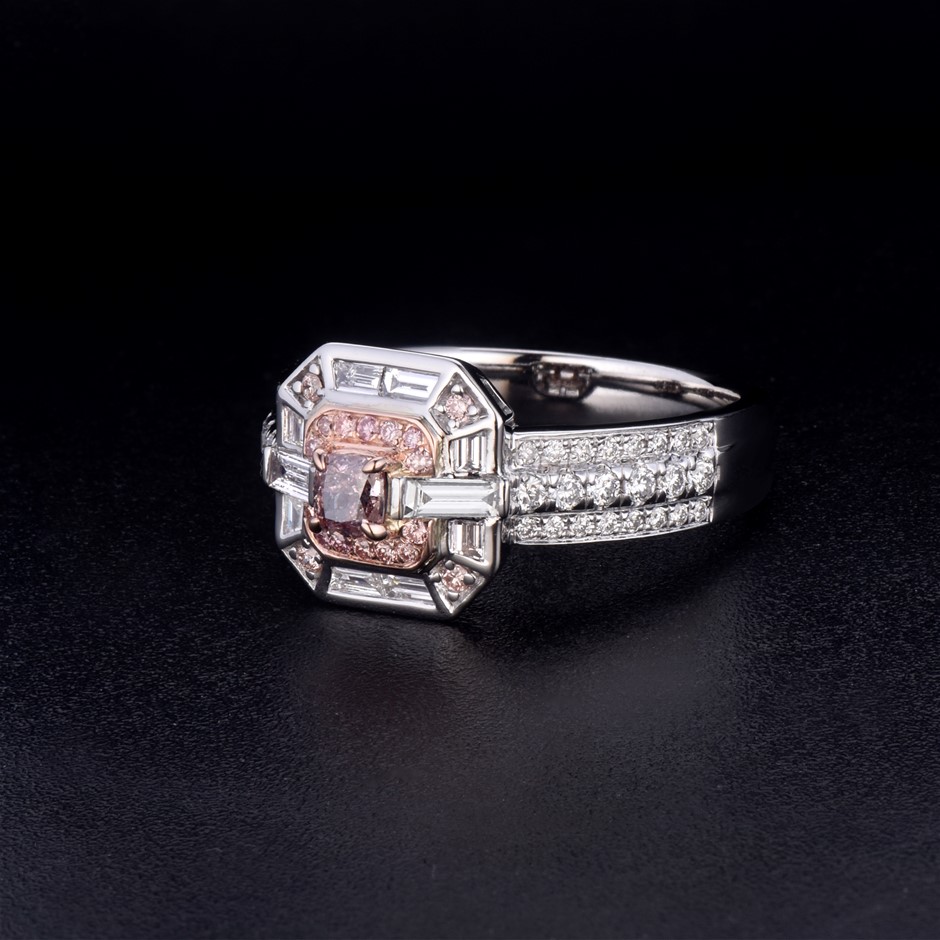 Item Description: One cast and assembled 9k white and rose gold ring with natural pink diamond in the centre and supporting melee CVD pink diamonds and CVD diamonds. The shank is flat-round. (Stamped G9K).