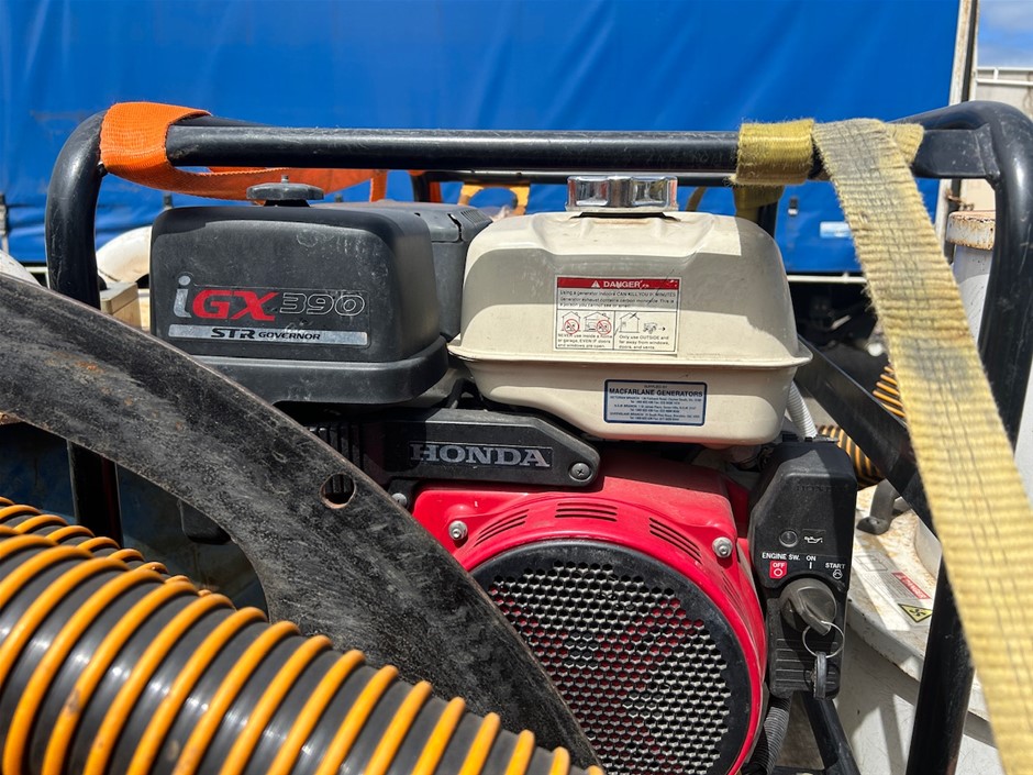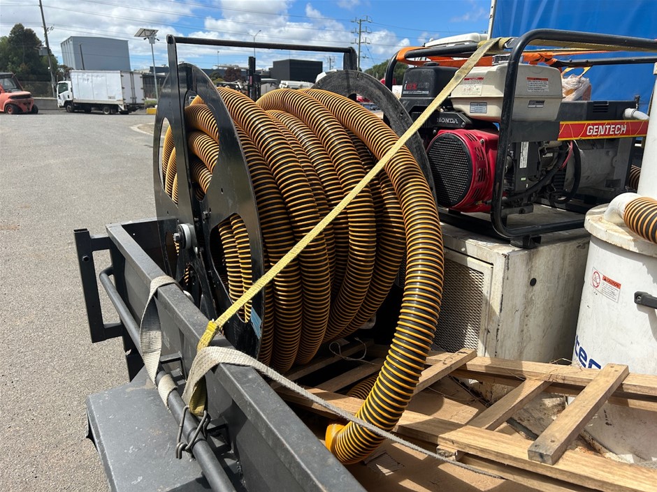• Vacuum Gutter Cleaning Trailer Unit with GenTech Inverter Generator iGX390 Petrol motor and Hose Reel. Tyres 185R14 5 Stud Rims. Spring Suspension. Single Axle. Tool Box. 50 mm Coupling.