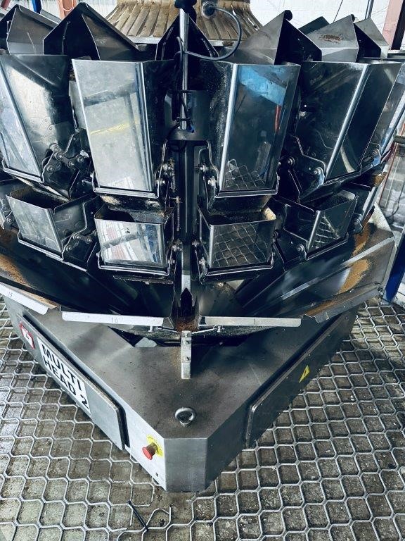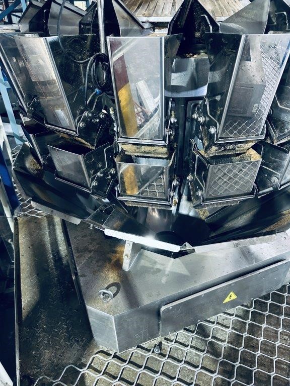 • stainless steel construction, comprising radial distribution cone, multi-head weigh buckets and discharge chute assembly, mounted on base frame. Reported capacity range of Approx. 0.5kg – 5kg per cycle. No manufacturer plate located on unit. Approximate overall dimensions: weigher Approx. 2,400mm H x 1,400mm diameter (installed height may vary depending on configuration).