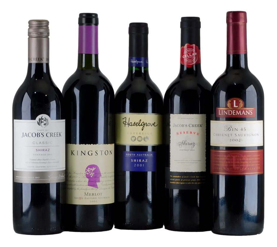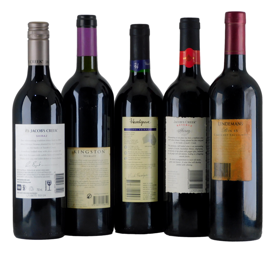 Haselgrove Sovereign Shiraz 2001Jacob`s Creek Reserve Shiraz 2004Jacob`s Creek Classic Shiraz 2016Kingston Merlot 2002Lindermans Bin 45 (damaged back label) - Cabernet Sauvignon 2002