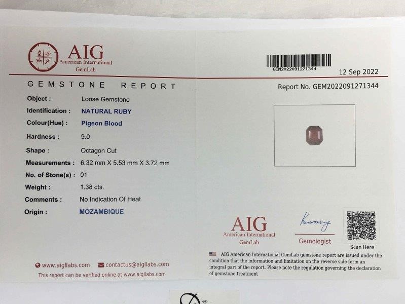 1.38ct One Stone Unheat Ruby Octagon With AIG Cert.