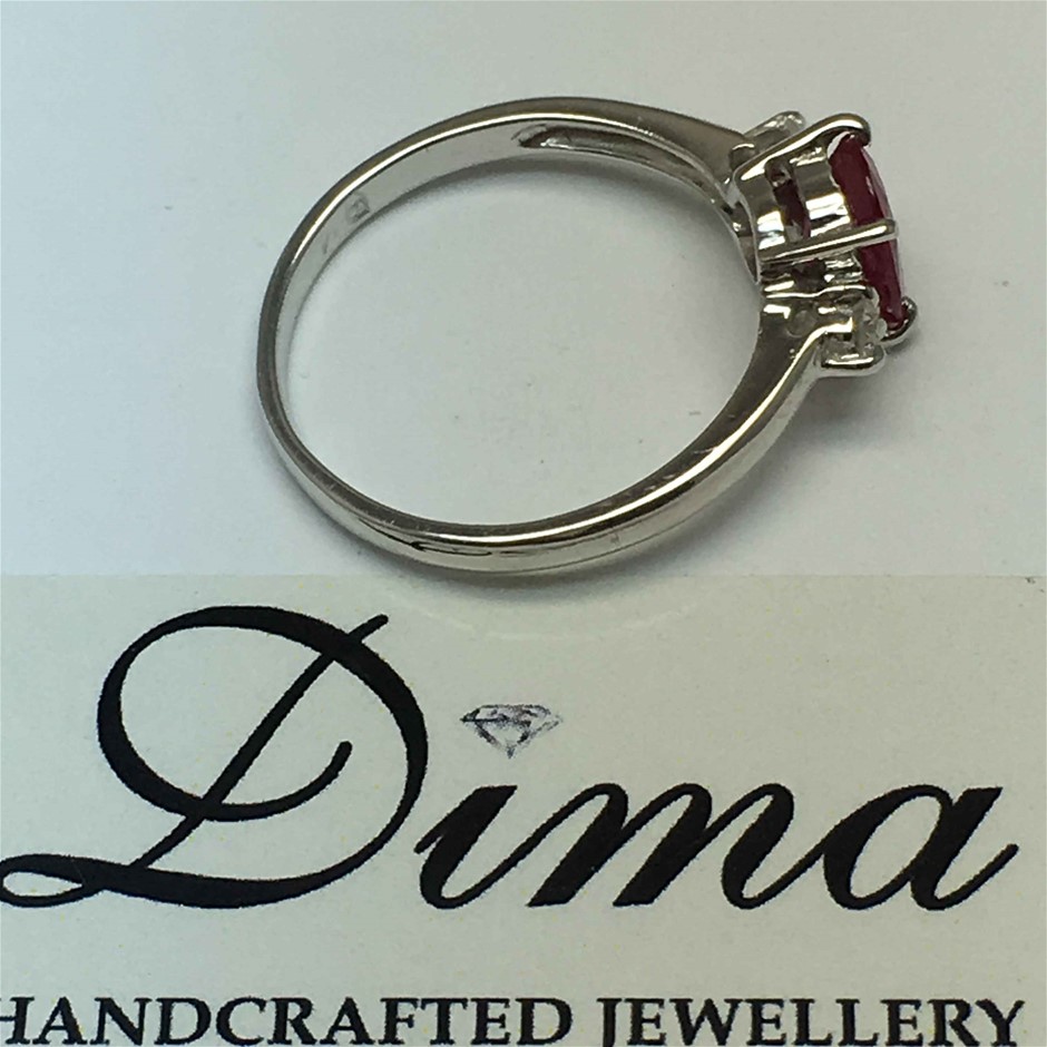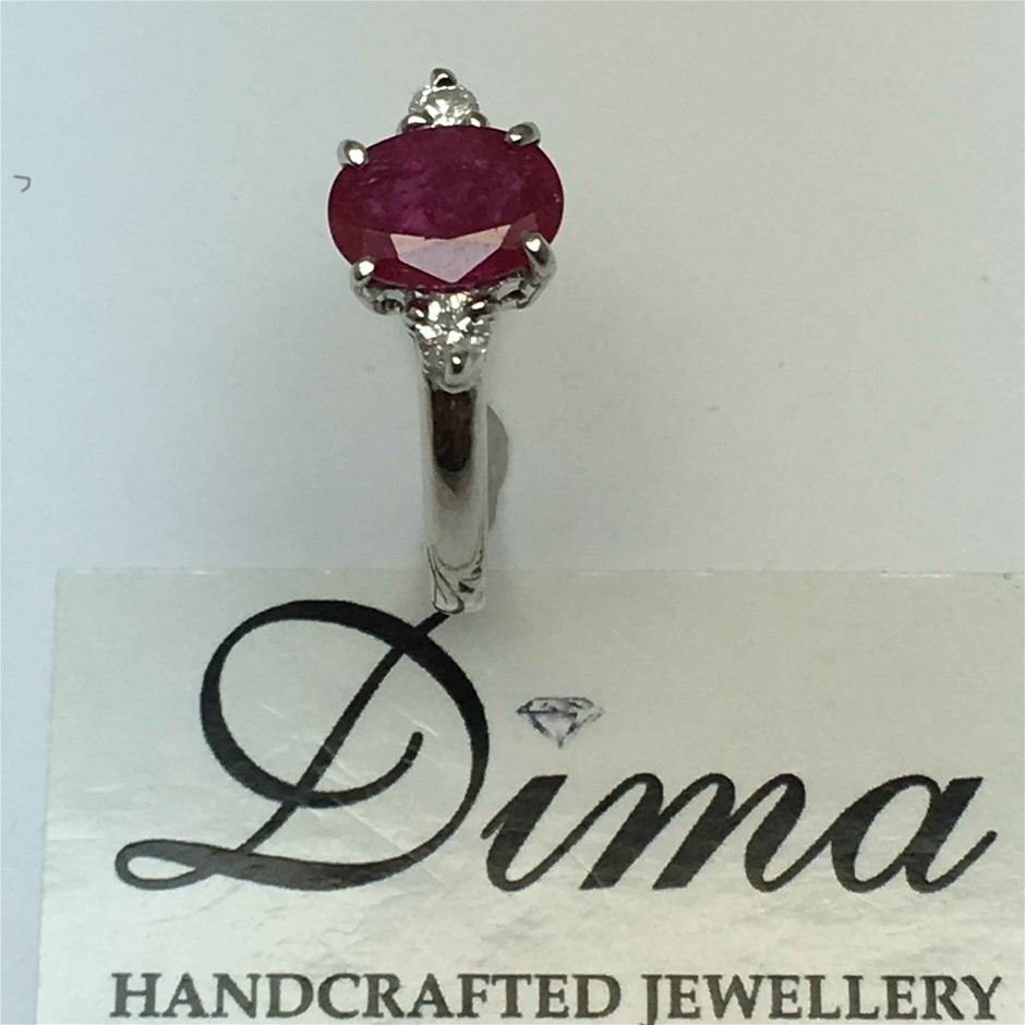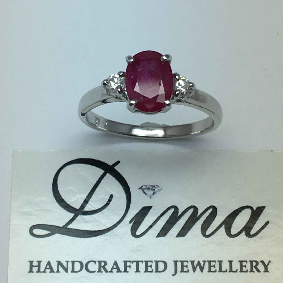 18ct white gold ruby and diamond ring. Featuring oval cut ruby, claw set, 1.46ct in weight (8.0 x 5.9mm), pinkish red in colour. 2 round brilliant cut diamonds, claw set, 0.08ct in total combined weight, SI in clarity and G in colour. Ring is 2.30 grams in weight and finger size K. Total Retail Replacement Value $10,000 (315612-1)