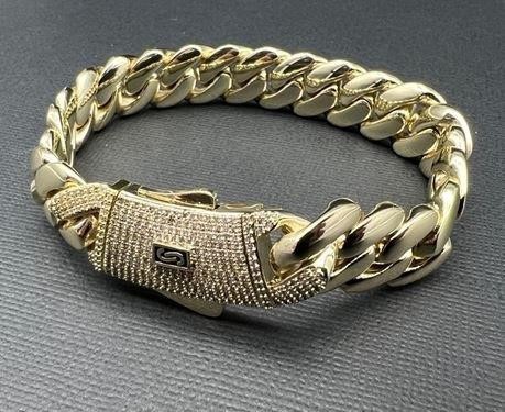 18K/Italy Triple Solid Yellow Gold Plated Cuban Bracelet -22.8cm-14mm