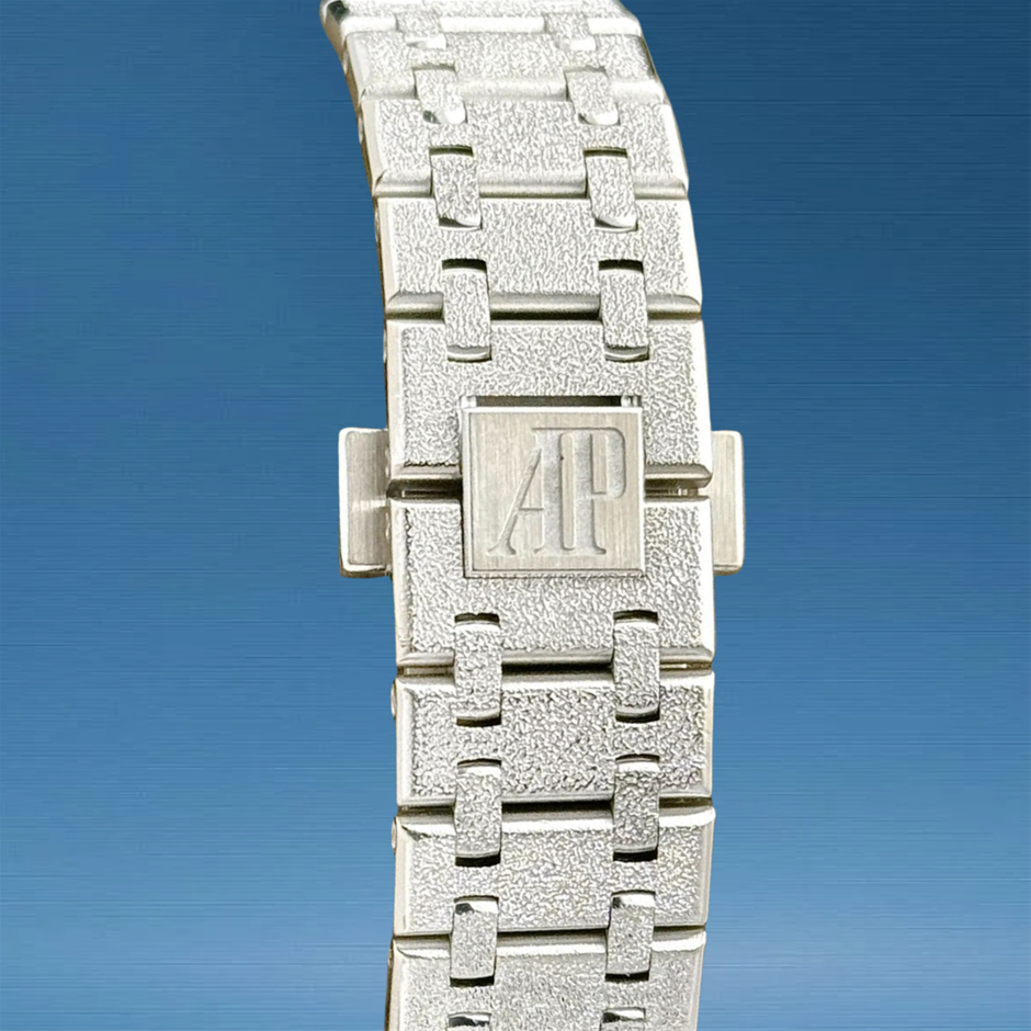 The Frosted Gold finish is achieved using a traditional Florentine hammering technique, creating a diamond-dust sparkle across the entire white gold surface. This jewellery-inspired treatment transforms the classic Royal Oak into a striking yet refined statement piece.