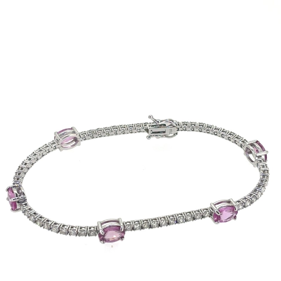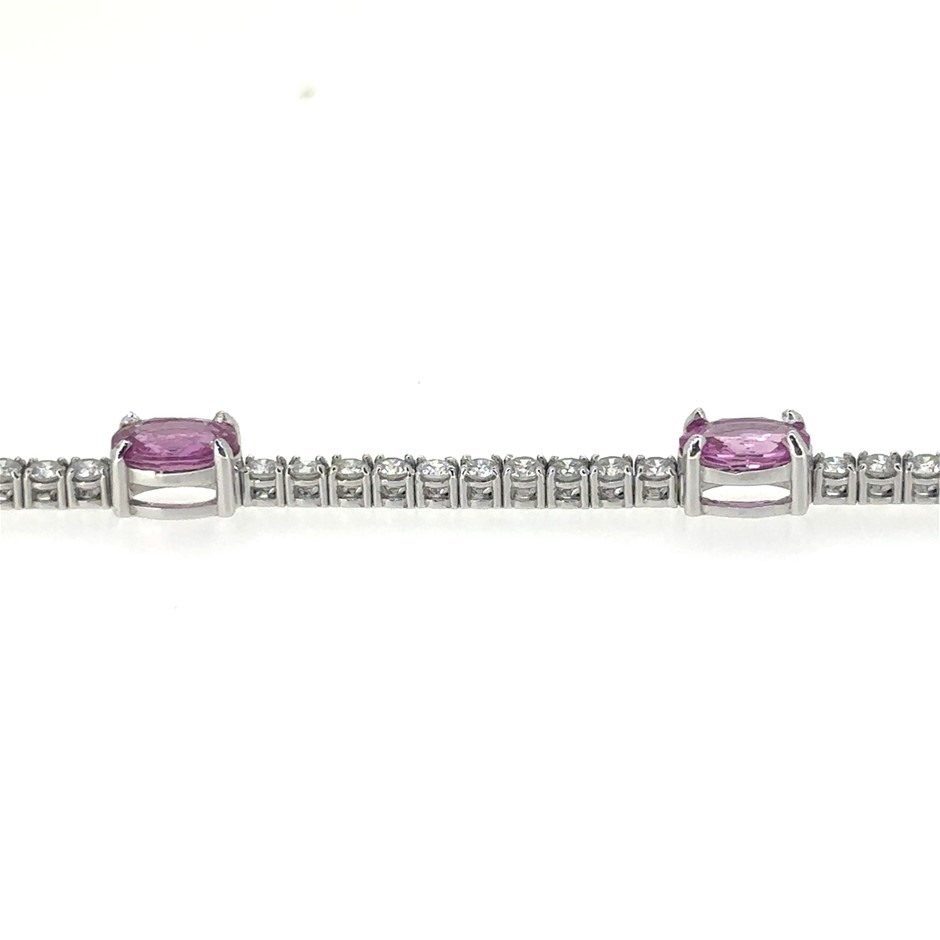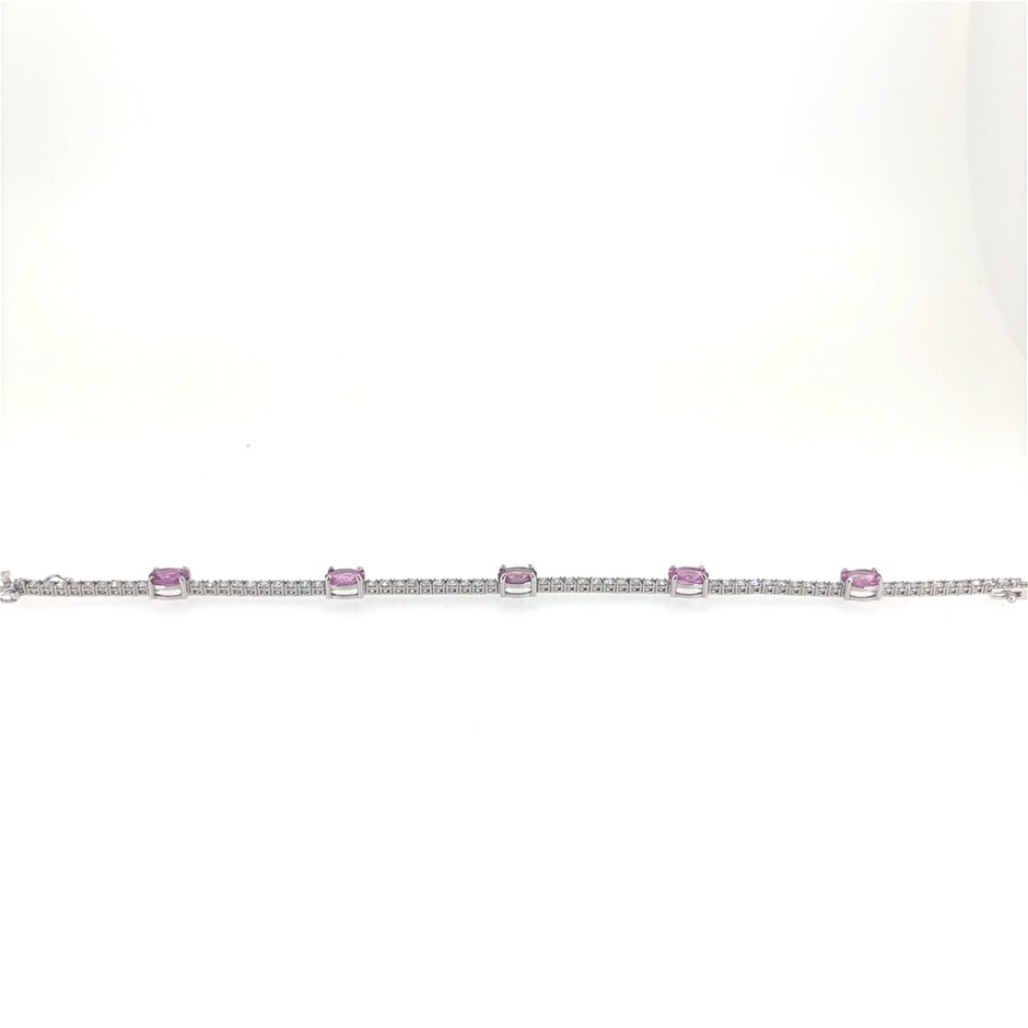 4.90ct 5 oval cut Pink Sapphire & 2.38ct 61 Stones Round Dia. G/SI Tennis Bracelet 18K White Gold