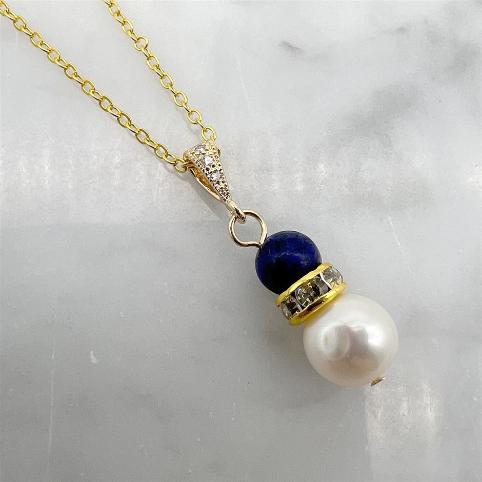 Genuine Freshwater Pearl & Lapis Lazuli Gemstone Gold Plated Pendant Necklace