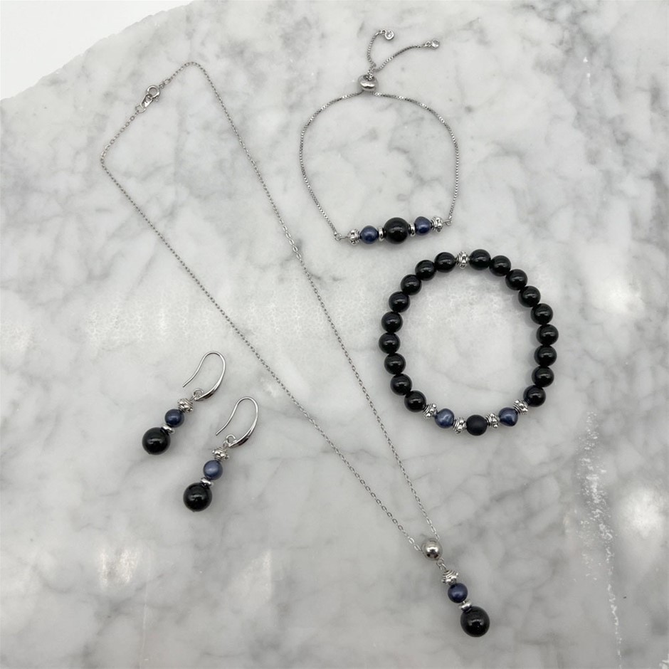 Black Agate, Frosted Agate & Freshwater Pearls Jewellery Set - 4 Pcs