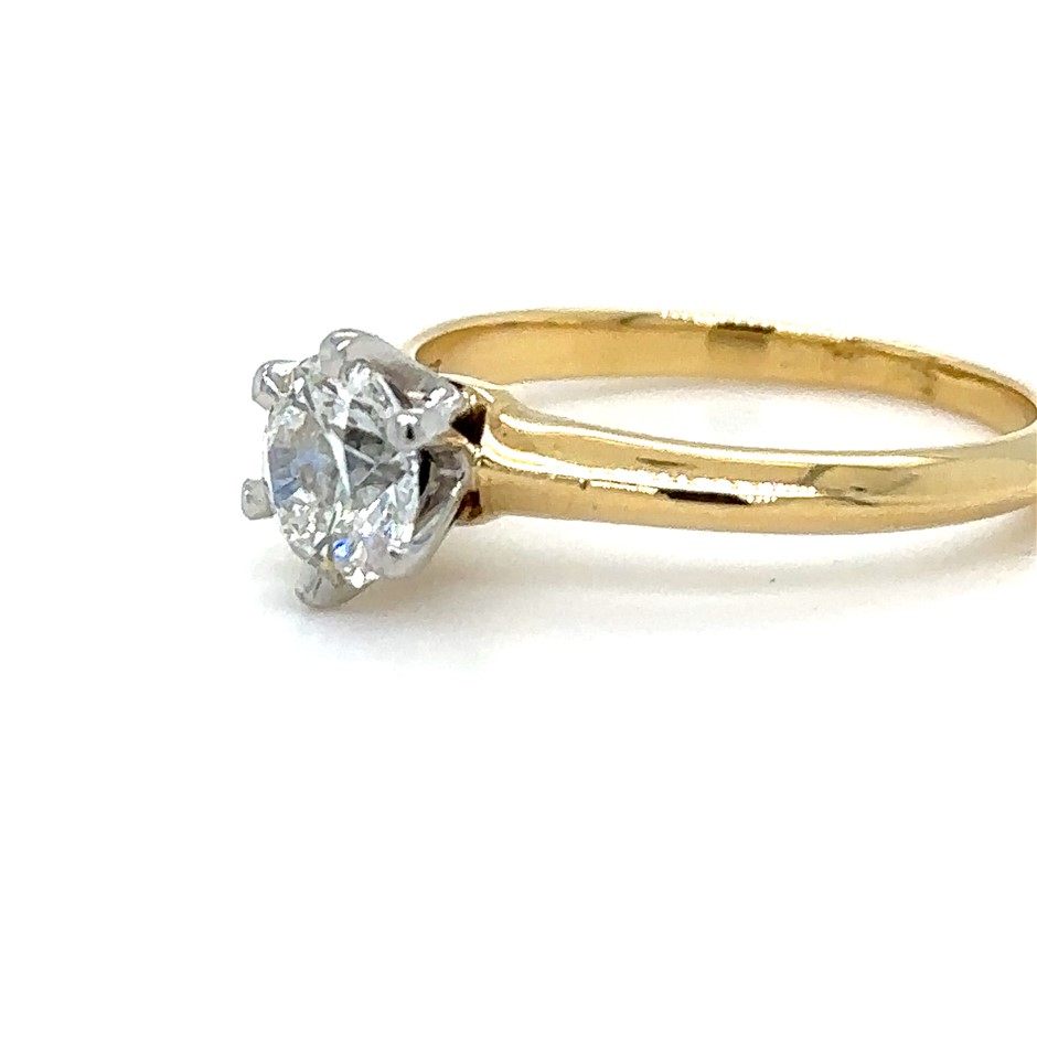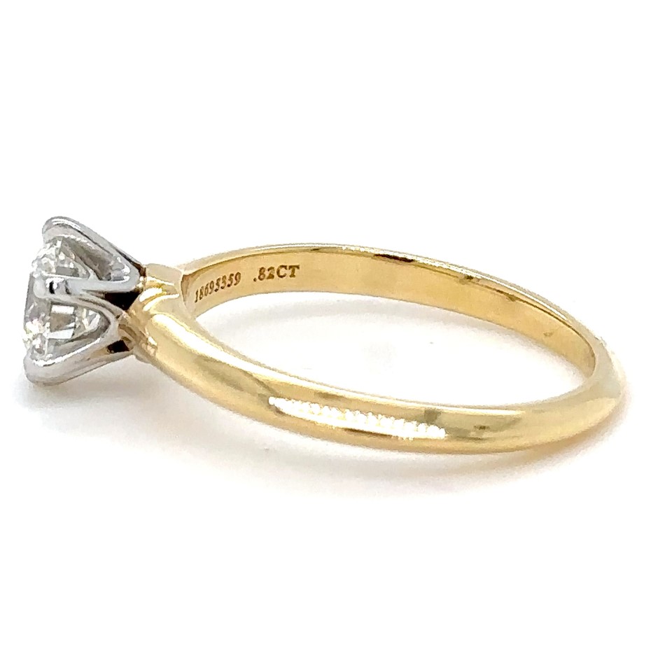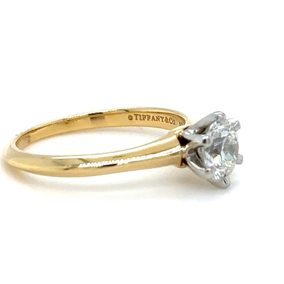 A Tiffany & Co Diamond Engagement Ring, made of 18ct Yellow Gold & Platinum. Set with a Single Round Brilliant Cut Diamond, F colour, VS + clarity with a total carat weight of 0.82ct.