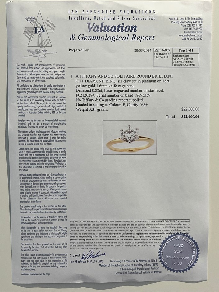 • Signed Tiffany & Co PT950 750 18695359 .82ct. Accompanied with Valuation Reference Number 36057 dated 20/03/2024 along with Tiffany & Co Green Box and Black Ring Box.