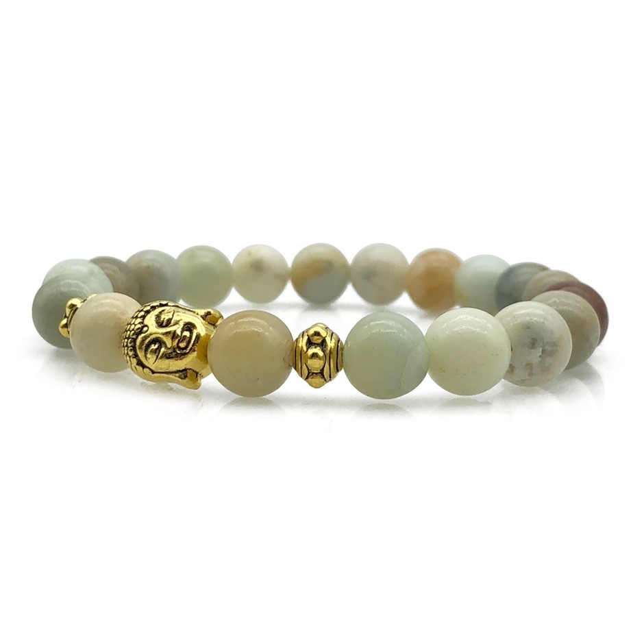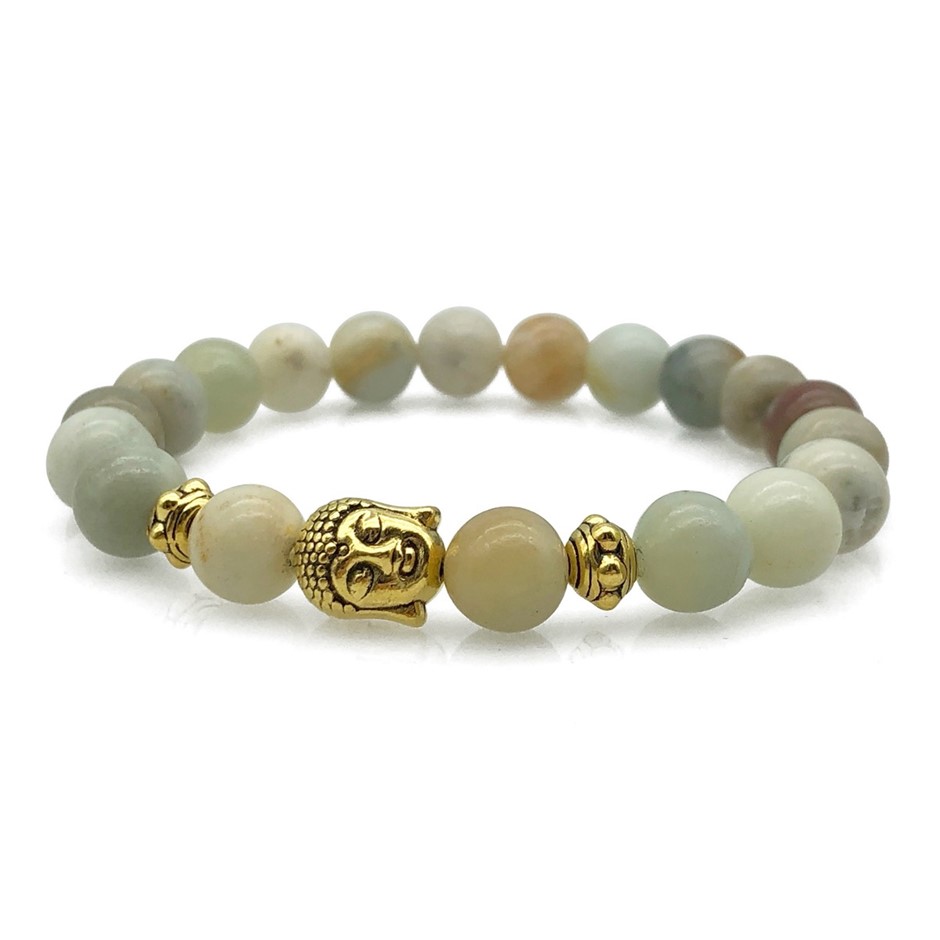 8mm Amazonite & Antique Gold Buddha Chakra Healing Charm Beaded Stretch Bracelet.