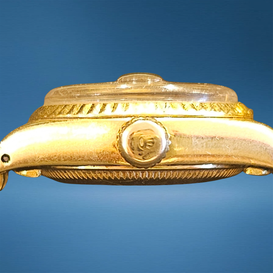This Rolex Datejust 69178 pairs classic 18K yellow gold elegance with refined Datejust proportions, offering timeless presence in a compact 26 mm profile. Its automatic movement and iconic Cyclops date window make it versatile for daily wear or formal occasions.