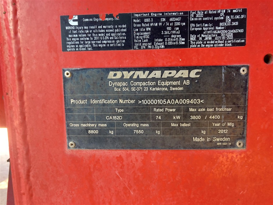 2012 Dynapac CA152D Roller - Smooth Single Drum - 7.3t (Derrimut)