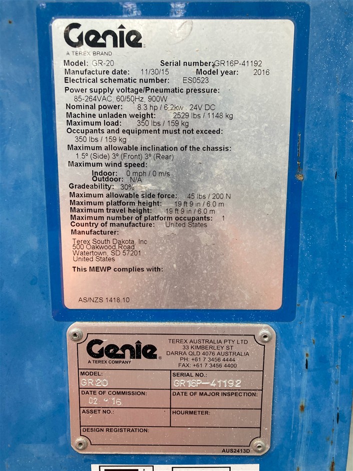 2016 Genie GR20 Personnel Lift - 20ft (6.2m) - Self Propelled - Pakenham