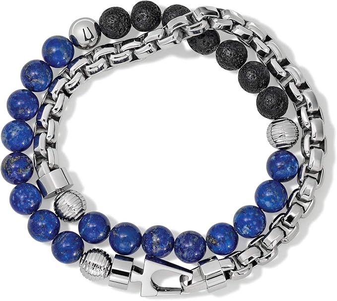 BULOVA Classic Double-Wrap Chain&Bead Bracelet, Stainless Steel/Semi-Precious Lapis. Buyers Note - Discount Freight Rates Apply to All Regional Areas(Code: B081FT168J-NE) (331993-3)