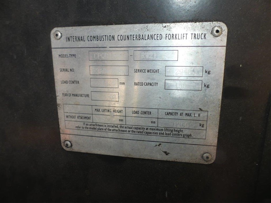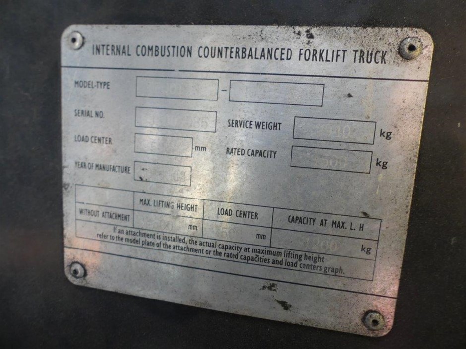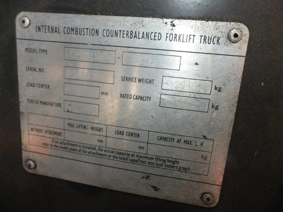 Disclaimer: Forklift Note - GraysOnline does not warrant information on compliance plates or information not available in the event of a compliance plate not fitted – this unit should be tested and certified as by legislation prior to use.