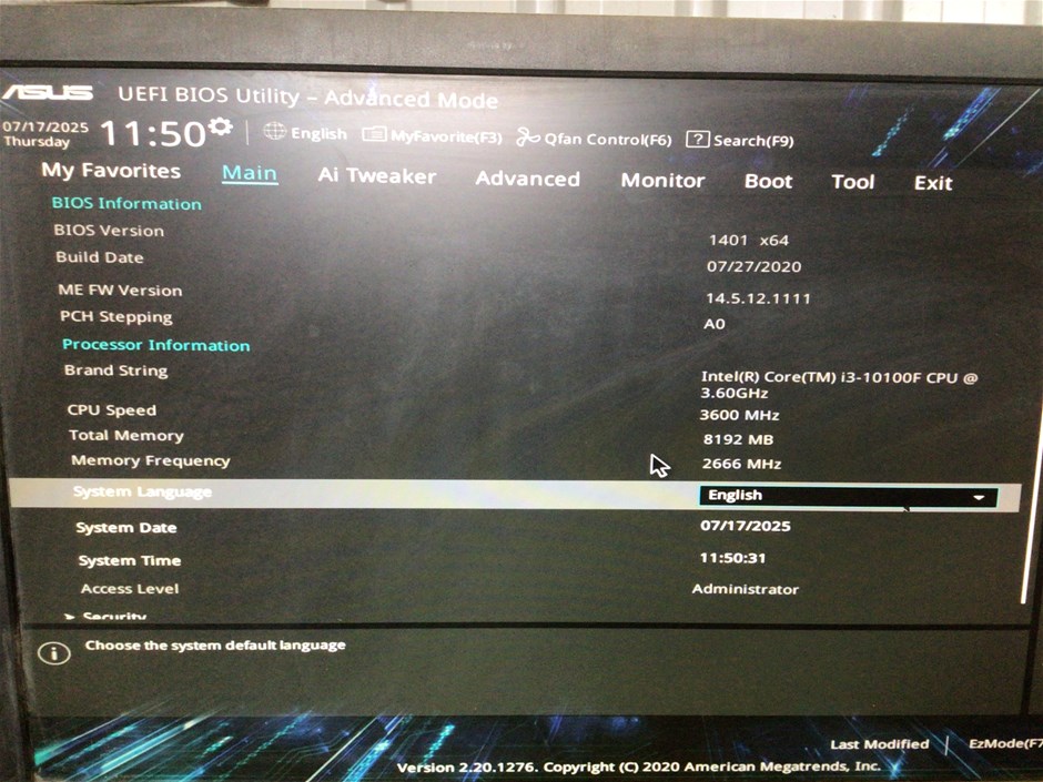 • No Hard Drive, Build date: 27/7/2020, Intel(R) Core (TM) i3-10100F CPU 3.6 GHz, CPU Speed: 3600 MHz, Memory: 8192 MB,