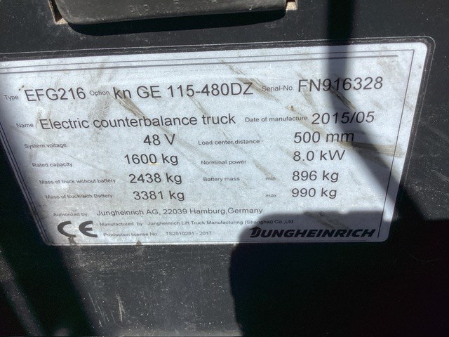 Jungheinrich EFG216KN-GE115-480DZ Counterbalance Forklift
