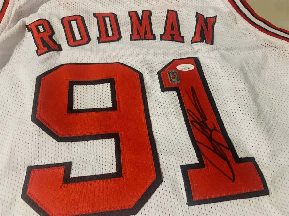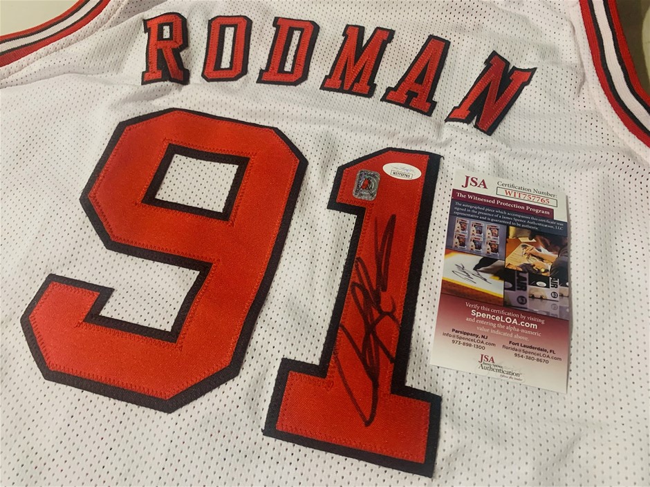 Custom jersey. Everything sewn on, size XL. Hand-signed by Dennis RodmanThe lot includes an official James Spence Authentication (JSA) tamper proof and traceable hologram for authenticity purposes numbered WIT757765. The signing of this item was witnessed by JSA. The item also comes with a matching certificate of authenticity. Item condition is `Used`, please refer to Sale Terms tab for definition. This item is sold on an `As Is` and `Where Is Basis`