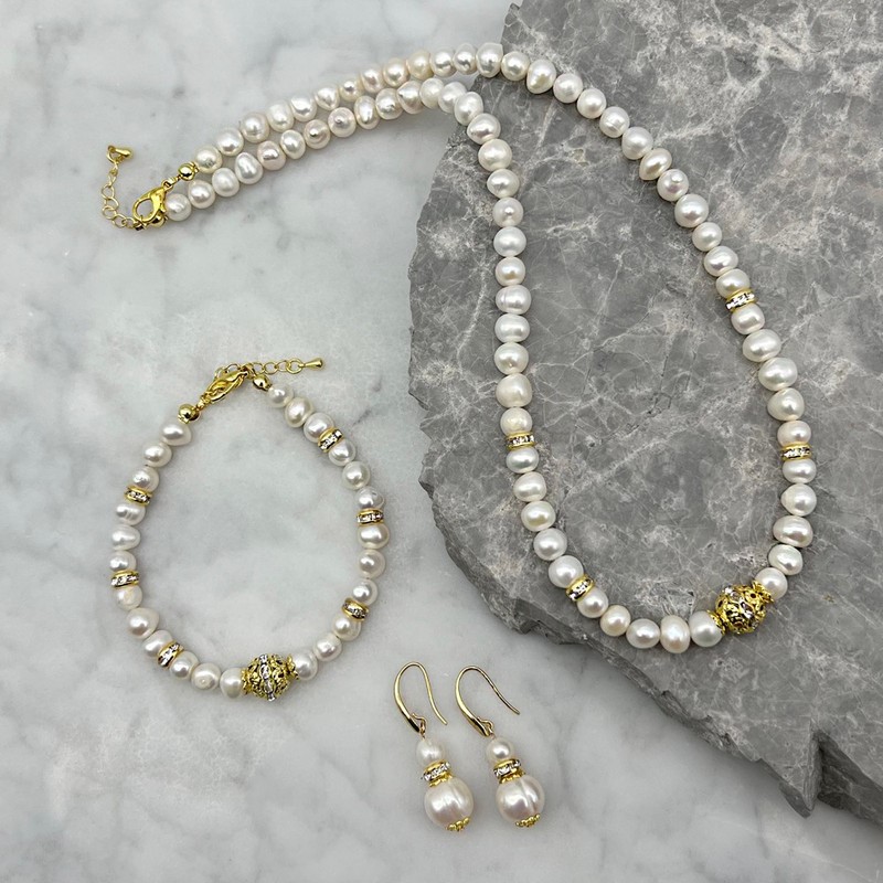 Natural 7-8mm White Freshwater Pearls & Rhinestone Gold Plated Necklace, Bracelet & Earring Set
