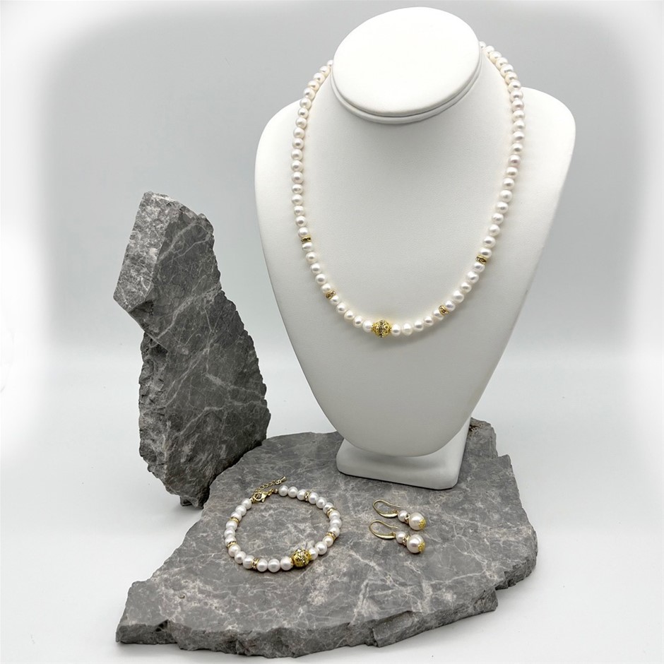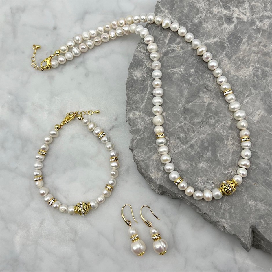 Natural 7-8mm White Freshwater Pearls & Rhinestone Gold Plated Necklace, Bracelet & Earring Set