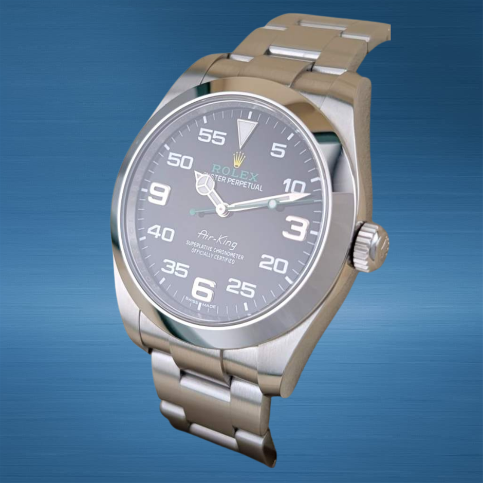 The Rolex Air-King 116900 is a bold reinterpretation of an aviation classic, blending historical roots with modern Rolex engineering. Introduced as a tribute to the golden age of flight, this contemporary 40mm stainless steel model features a distinctive black dial with prominent Arabic numerals and the green-and-yellow Rolex logo—hallmarks of the new-generation Air-King. With its robust Oyster case, smooth polished bezel, and precise self-winding movement, the 116900 is built for both everyday wear and elevated wrist presence.