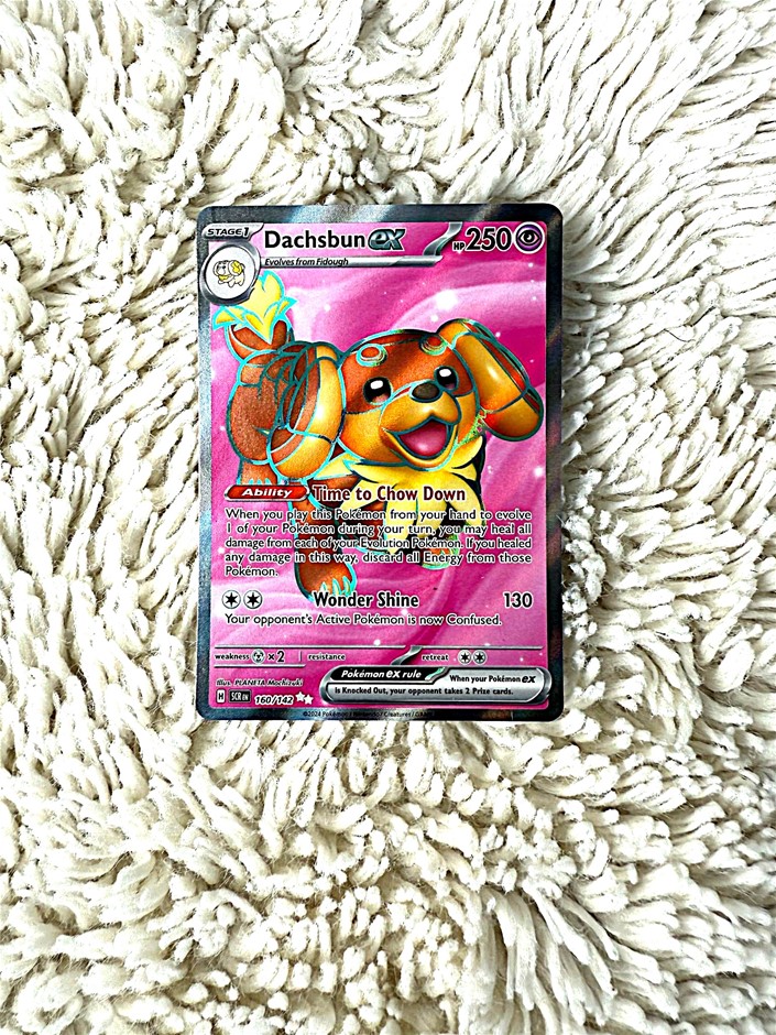 This adorable yet powerful Dachsbun EX #160/142 features a shining Holo finish and detailed artwork from the Scarlet & Violet era. Though not professionally graded, it is in very good condition, making it a great pick for both collectors and competitive players.