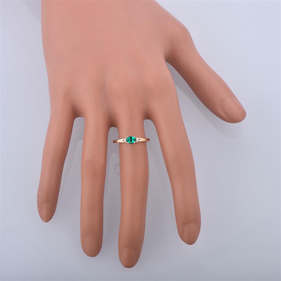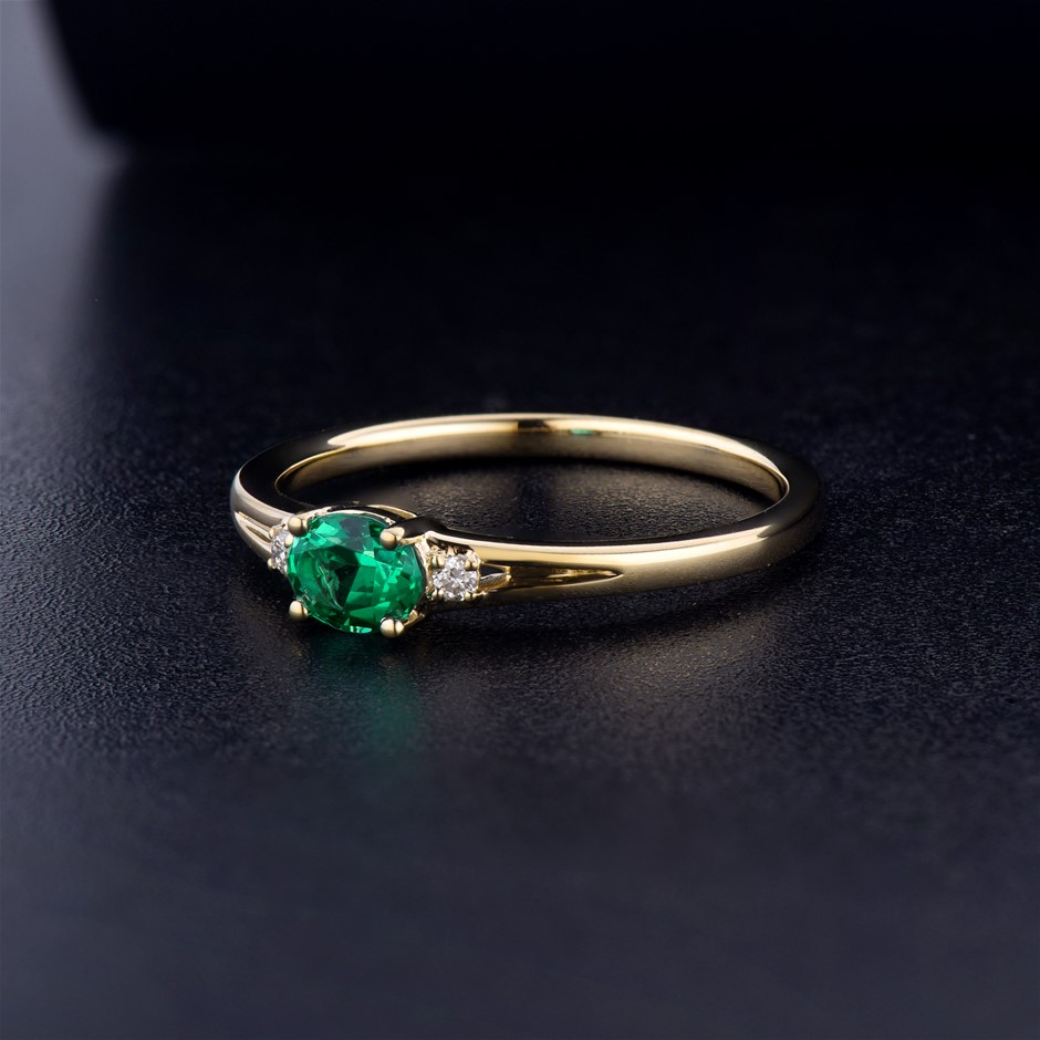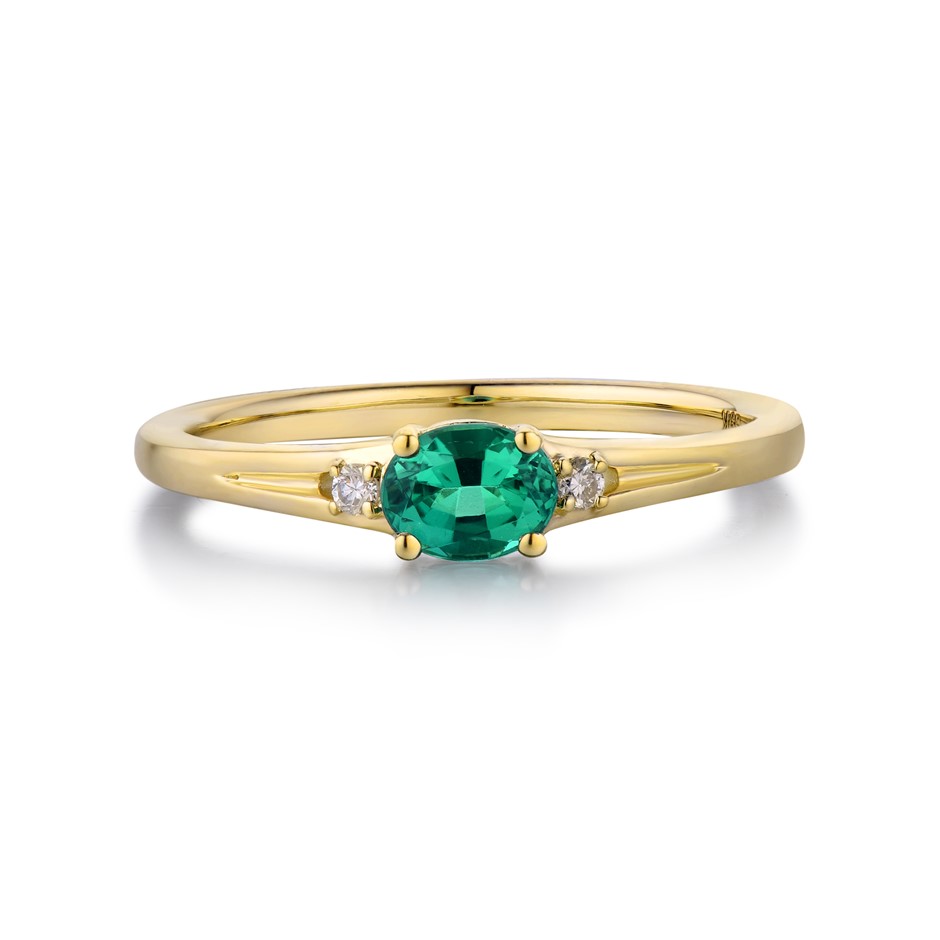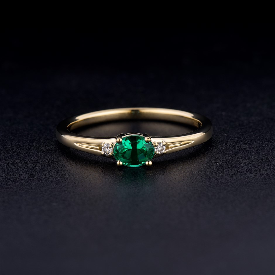 Item Description: One cast and assembled 9k yellow gold trilogy ring with natural emerald in the centre and supporting CVD diamonds on the sides. The shank is half-round. (Stamped G9K).