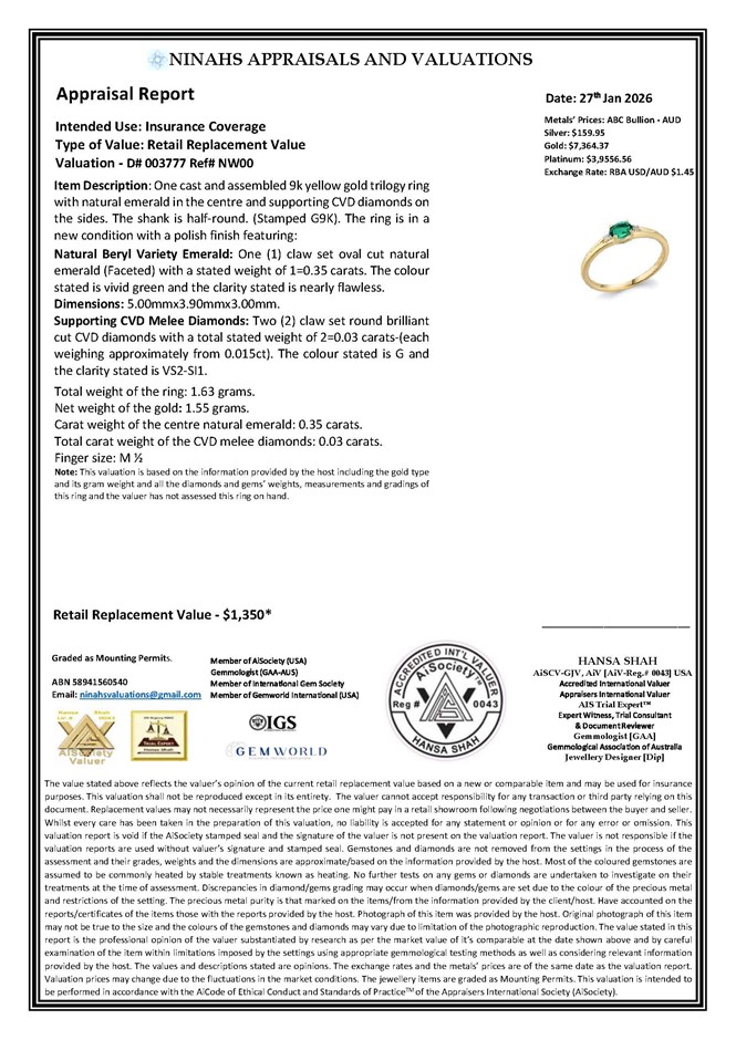 Natural Beryl Variety Emerald: One (1) claw set oval cut natural emerald with a stated weight of 1=0.35 carats. The colour stated is vivid green and the clarity stated is nearly flawless.