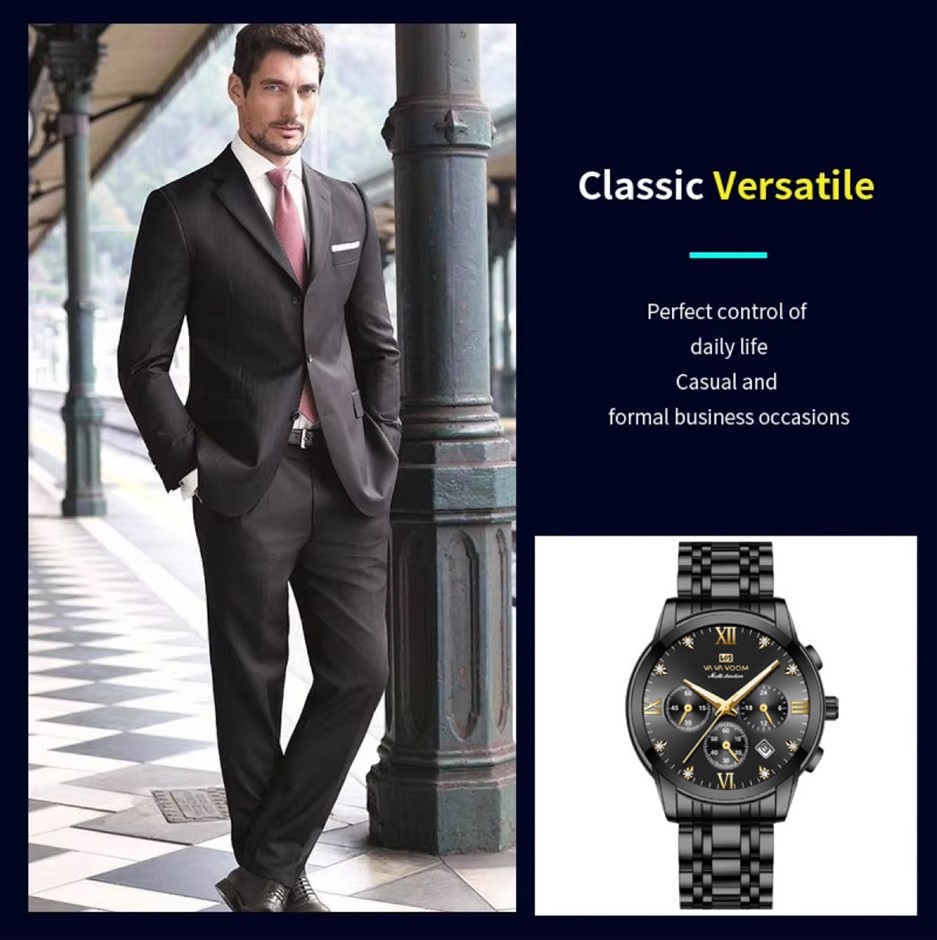 The watch has a multifunctional dial, offering 5 in 1 multifunctional innovative timing, simple and easy to understand sub dial, calander window, stopwatch dial, 24H timing dial and luminous pointer.