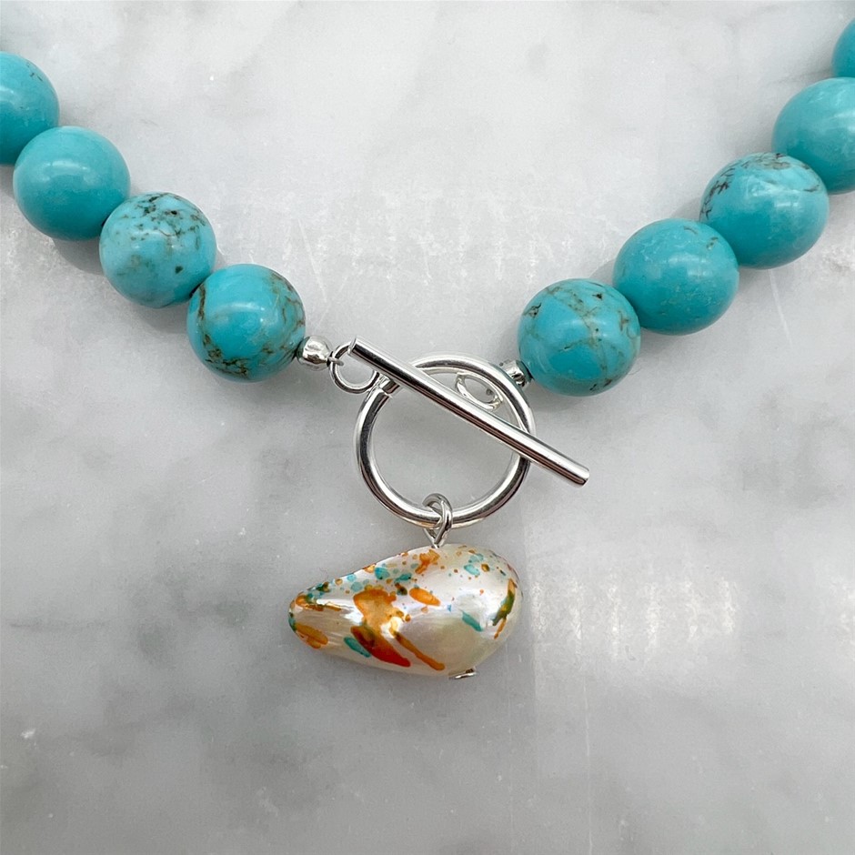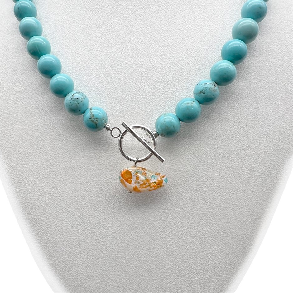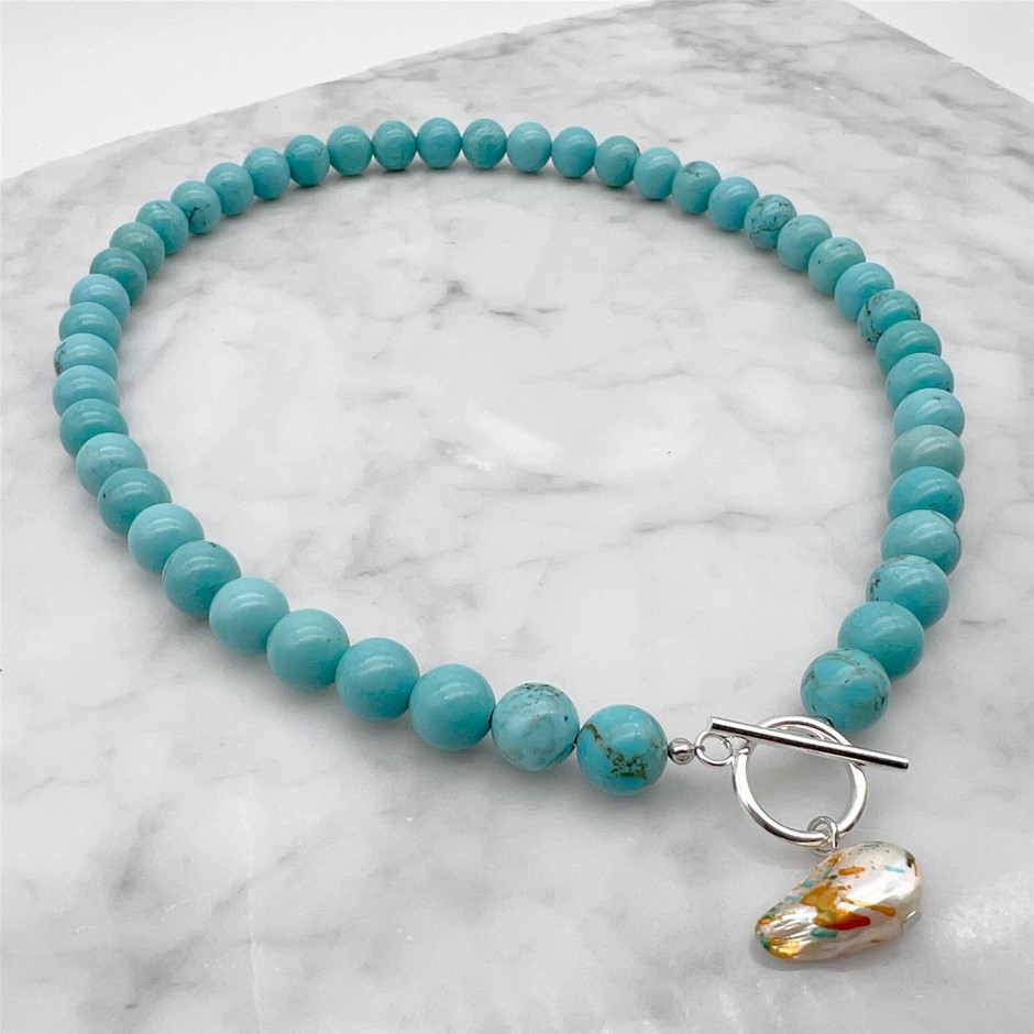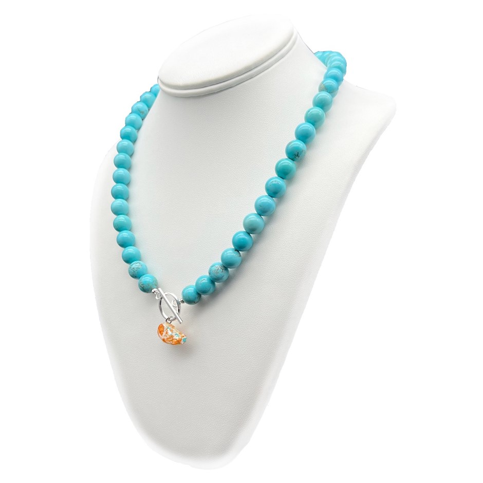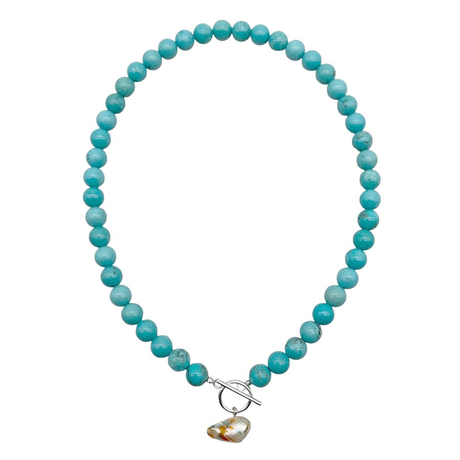 10mm Turquoise with `O` Toggle Gemstone Beaded Necklace.