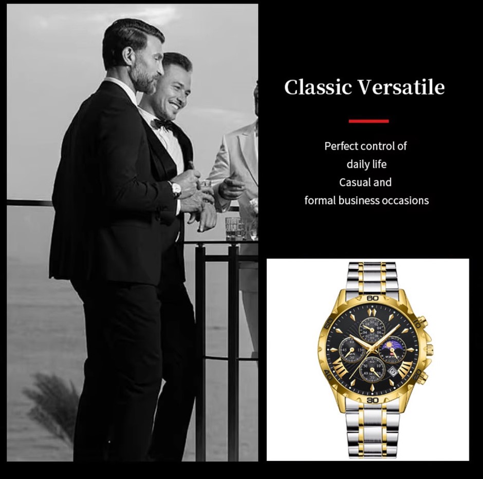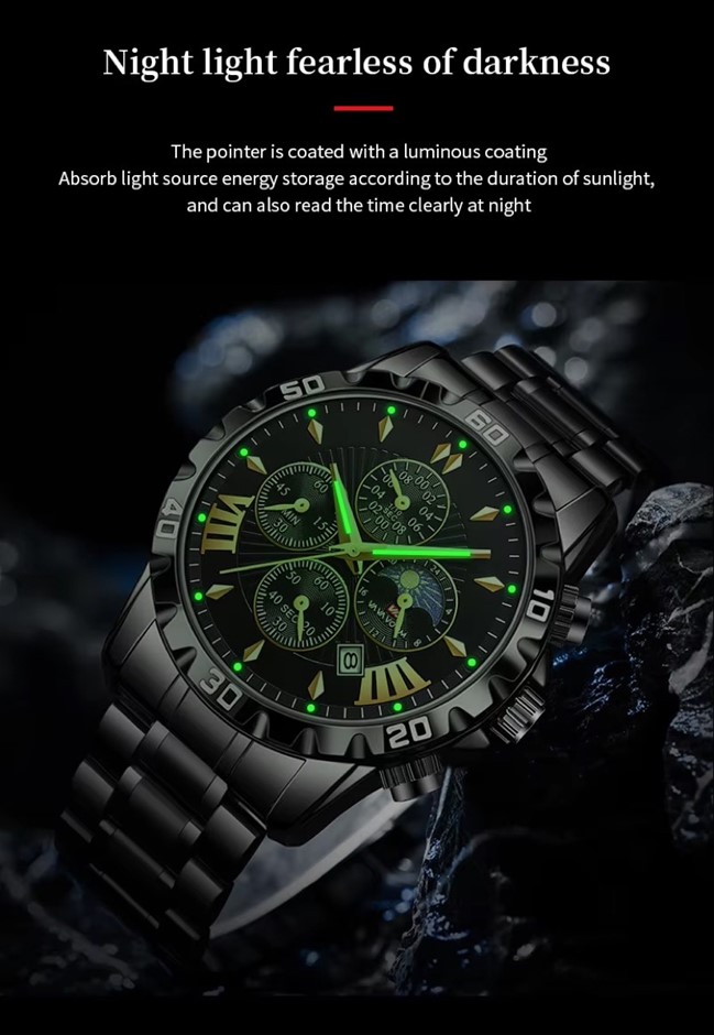 The watch has a multifunctional dial, offering 7 in 1 multifunctional innovative timing, simple and easy to understand sub dial, calendar window, stopwatch dial, 24H timing dial and luminous pointer. It also has the added feature of being water resistant and has a glow in the dark face.