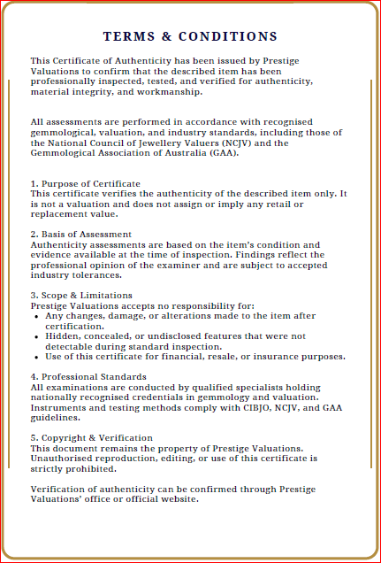 The Certificate of Authenticity means that the actual item for sale has been assessed by a fully qualified specialist jewellery valuer. The specialist jewellery valuer requires knowledge of gemmology, jewellery manufacture, precious metal markets, world gem markets, supply and demand factors both overseas and within Australia, taxation law requirements, general retail practices and the final combination of all the above factors in the principle and procedures of a jewellery valuation. They inspect and assess the jewellery item using a hand lens taking note of several key factors-