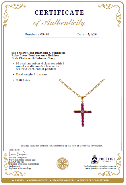 9ct Yellow Gold Diamond & Synthetic Ruby Cross Pendant on a Belcher Link