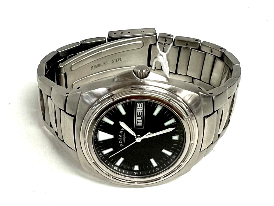 quartz movement, black dial with silver/luminous hour makers & day/date display, case measures 36mm, water resistant 50m, stainless steel strap with fold over deployment clasp, certificate of authenticity (303076-5)