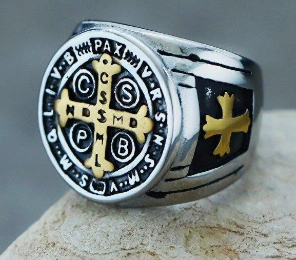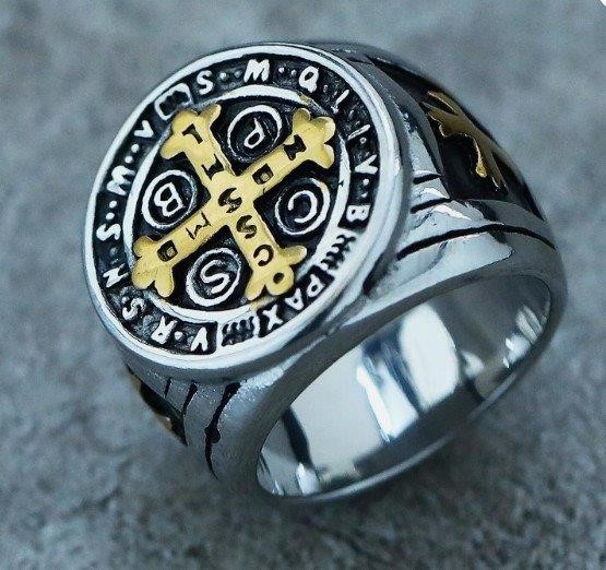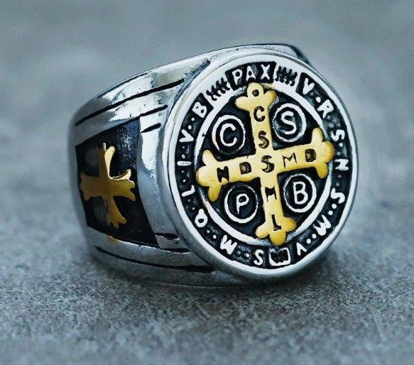 • This exquisite gold ring showcases the St. Benedict Medal, intricately designed with classic symbols of faith, including the Latin inscription that represents protection against evil. The ring’s bold design and quality craftsmanship make it a striking accessory for everyday wear or special occasions.