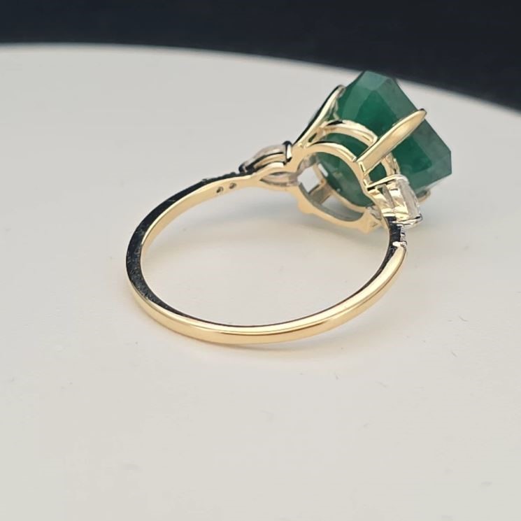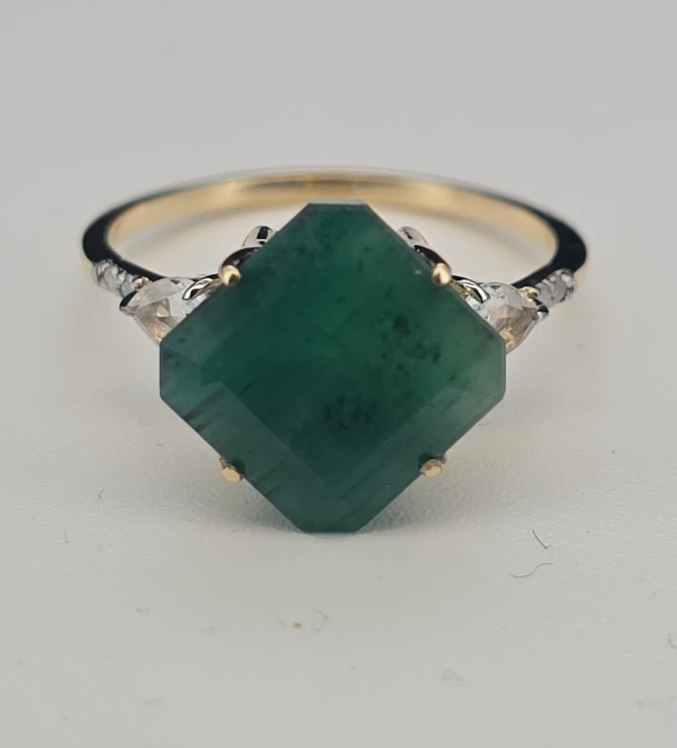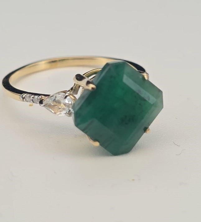 • The Ring consists of (1) Octagon Brilliant Natural Emerald & (2) Round Brilliant Cut White Topaz. Surrounding the main stones are Round Brilliant Cut Natural Diamonds.