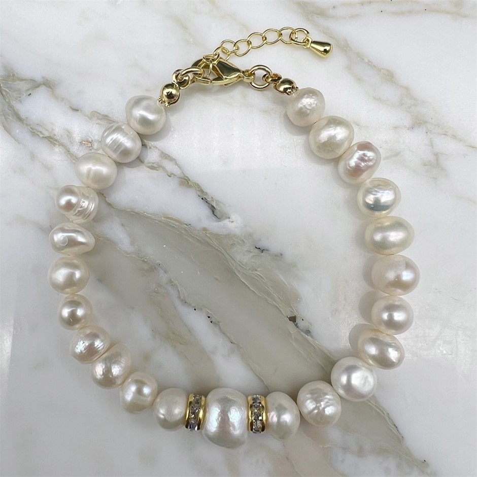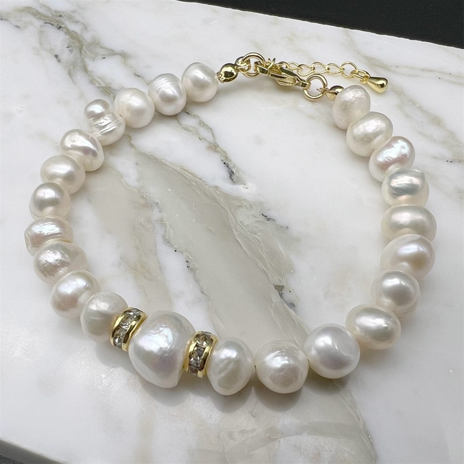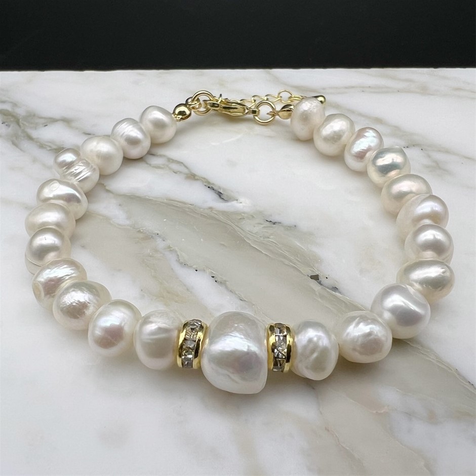 Natural Mix Shape - Large Central White Freshwater Pearl & Rhinestone 18k Gold Plated Bracelet.