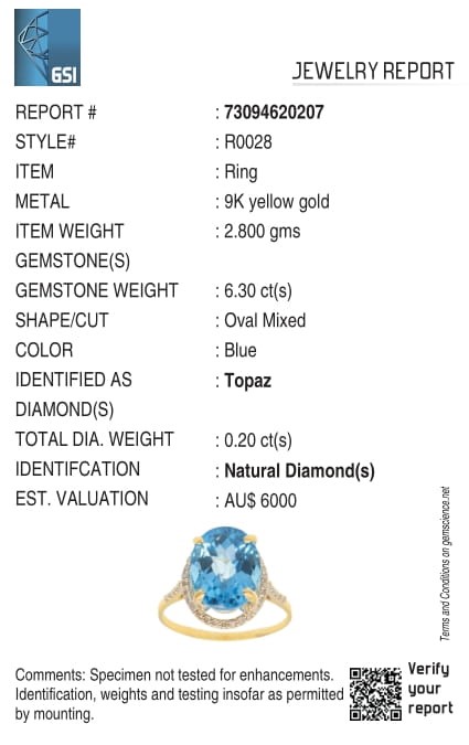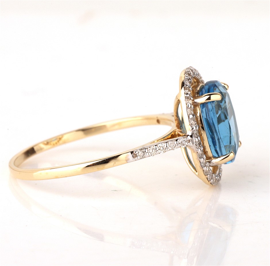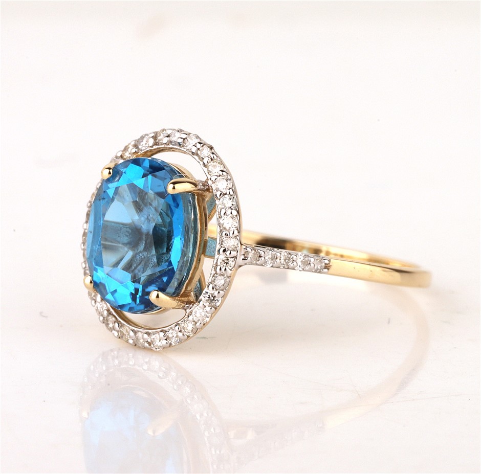 Yellow Gold Natural Swiss Blue Topaz & Diamond Ring with Valuation