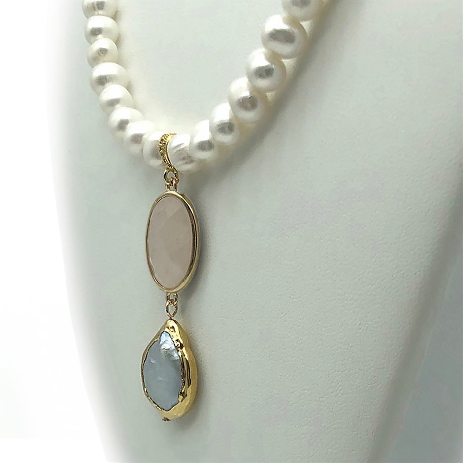 7-8mm Natural Potato & Baroque Freshwater Pearl with Rose Quartz Real 18k Gold Plated Necklace.